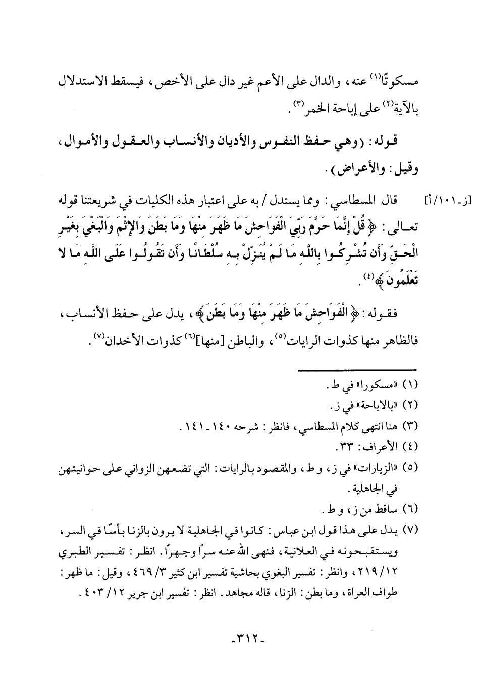قال المسطاسي: ومما يستدل به على اعتبار هذه الكليات في شريعتنا قوله تعالى: {قُلْ إِنَّمَا حَرَّمَ رَبِّيَ الْفَوَاحِشَ مَا ظَهَرَ مِنْهَا وَمَا بَطَنَ وَالْإِثْمَ وَالْبَغْيَ بِغَيْرِ الْحَقِّ وَأَنْ تُشْرِكُوا بِاللَّهِ مَا لَمْ يُنَزِّلْ بِهِ سُلْطَانًا وَأَنْ تَقُولُوا عَلَى اللَّهِ مَا لَا تَعْلَمُونَ} (¬4).