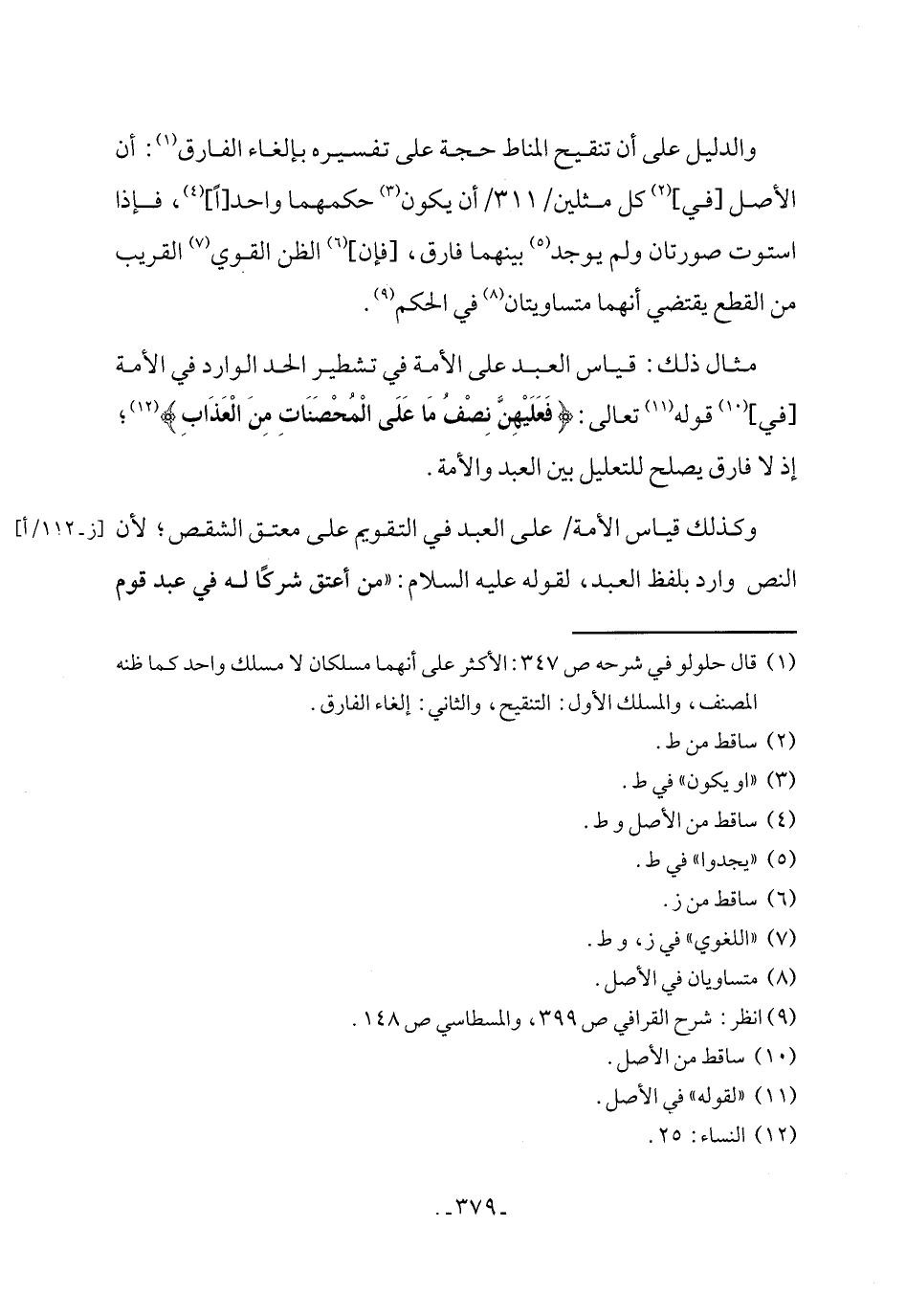 مثال ذلك: قياس العبد على الأمة في تشطير الحد الوارد في الأمة [في] (¬10) قوله (¬11) تعالى: {فَعَلَيْهِنَّ نِصْفُ مَا عَلَى الْمُحْصَنَاتِ مِنَ الْعَذَابِ} (¬12)؛ إذ لا فارق يصلح للتعليل بين العبد والأمة.