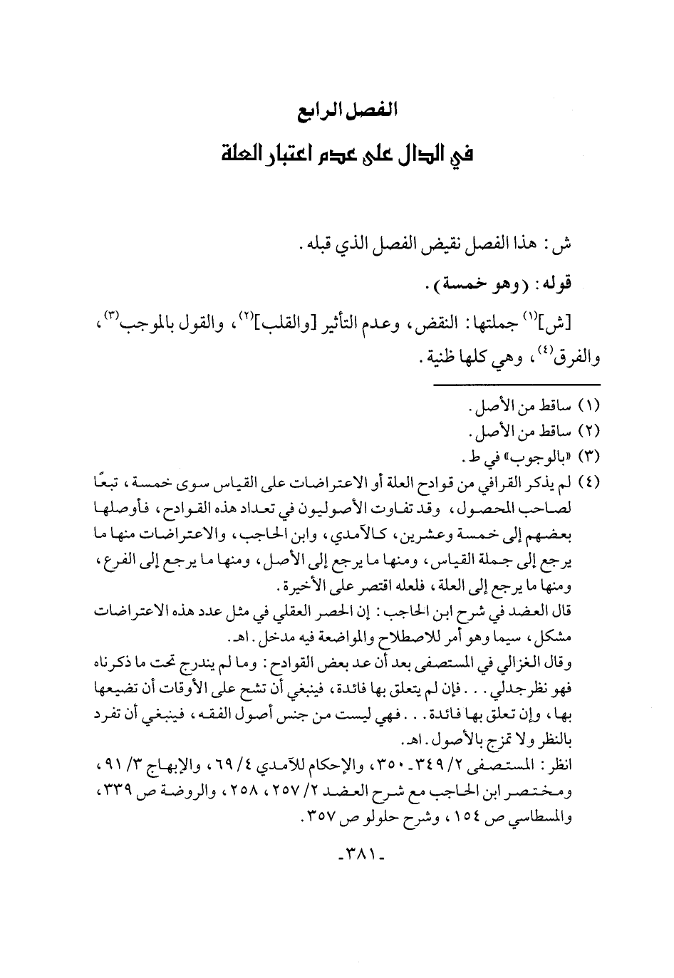 (¬4) لم يذكر القرافي من قوادح العلة أو الاعتراضات على القياس سوى خمسة، تبعًا لصاحب المحصول، وقد تفاوت الأصوليون في تعداد هذه القوادح، فأوصلها بعضهم إلى خمسة وعشرين، كالآمدي، وابن الحاجب، والاعتراضات منها ما يرجع إلى جملة القياس، ومنها ما يرجع إلى الأصل، ومنها ما يرجع إلى الفرع، ومنها ما يرجع إلى العلة، فلعله اقتصر على الأخيرة.