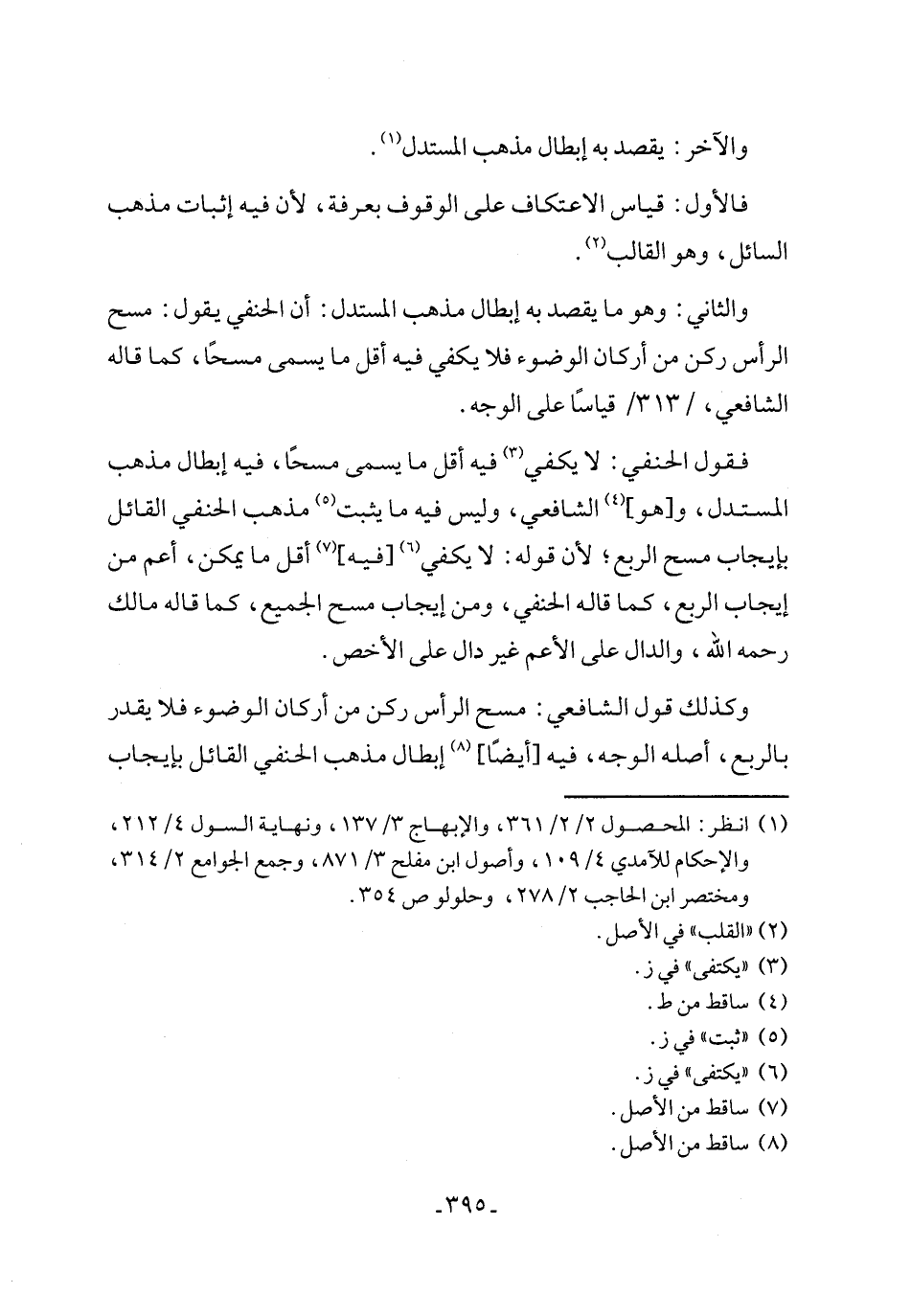 والثاني: وهو ما يقصد به إبطال مذهب المستدل: أن الحنفي يقول: مسح الرأس ركن من أركان الوضوء فلا يكفي فيه أقل ما يسمى مسحًا، كما قاله الشافعي،/ 313/ قياسًا على الوجه.