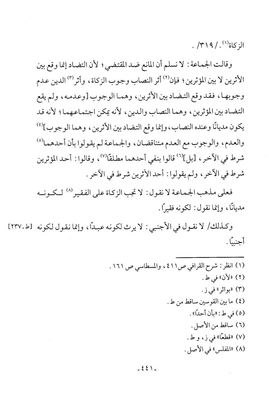 وقالت الجماعة: لا نسلم أن المانع ضد المقتضي؛ لأن التضاد إنما وقع بين الأثرين لا بين المؤثرين؛ فإن (¬2) أثر النصاب وجوب الزكاة، وأثر (¬3) الدين عدم وجوبها، فقد وقع التضاد بين الأثرين، وهما الوجوب [وعدمه، ولم يقع التضاد بين المؤثرين، وهما النصاب والدين، لأنه يمكن اجتماعهما؛ لأنه قد يكون مديانًا وعنده النصاب، وإنما وقع التضاد بين الأثرين، وهما الوجوب] (¬4) والعدم، والوجوب مع العدم متناقضان، والجماعة لم يقولوا بأن أحدهما (¬5) شرط في الآخر، [بل] (¬6) قالوا بنفي أحدهما مطلقًا (¬7)، وقالوا: أحد المؤثرين شرط في الآخر، ولم يقولوا: أحد الأثرين شرط في الآخر.