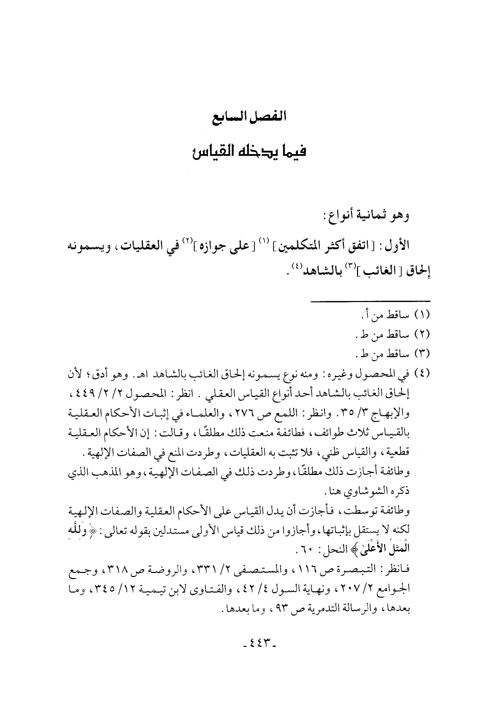 (¬4) في المحصول وغيره: ومنه نوع يسمونه إلحاق الغائب بالشاهد اهـ. وهو أدق؛ لأن إلحاق الغائب بالشاهد أحد أنواع القياس العقلي. انظر: المحصول 2/ 2/ 449، والإبهاج 3/ 35. وانظر: اللمع ص 276، والعلماء في إثبات الأحكام العقلية بالقياس ثلاث طوائف، فطائفة منعت ذلك مطلقًا، وقالت: إن الأحكام العقلية قطعية، والقياس ظني، فلا تثبت به العقليات، وطردت المنع في الصفات الإلهية.