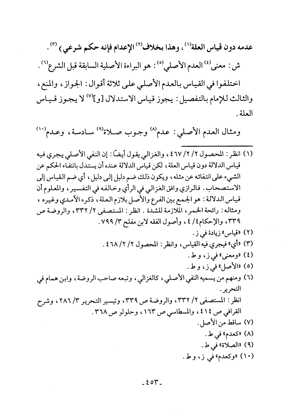 (¬1) انظر: المحصول 2/ 2/ 467، والغزالي يقول أيضًا: إن النفي الأصلي يجري فيه قياس الدلالة دون قياس العلة، لكن قياس الدلالة عنده أن يستدل بانتفاء الحكم عن الشيء على انتفائه عن مثله، ويكون ذلك ضم دليل إلى دليل، أي ضم القياس إلى الاستصحاب. فالرازي وافق الغزالي في الرأي وخالفه في التفسير، والمعلوم أن قياس الدلالة: هو الجمع بين الفرع والأصل بلازم العلة، ذكره الآمدي وغيره، ومثاله: رائحة الخمر، الملازمة للشدة. انظر: المستصفى 2/ 332، والروضة ص 339، والإحكام 4/ 4، وأصول الفقه لابن مفلح 3/ 799.