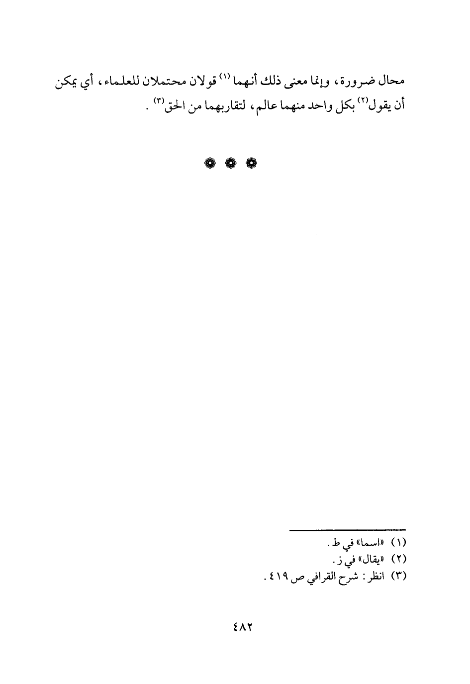 محال ضرورة، وإنما معنى ذلك أنهما (¬1) قولان محتملان للعلماء، أي يمكن أن يقول (¬2) بكل واحد منهما عالم، لتقاربهما من الحق (¬3).
