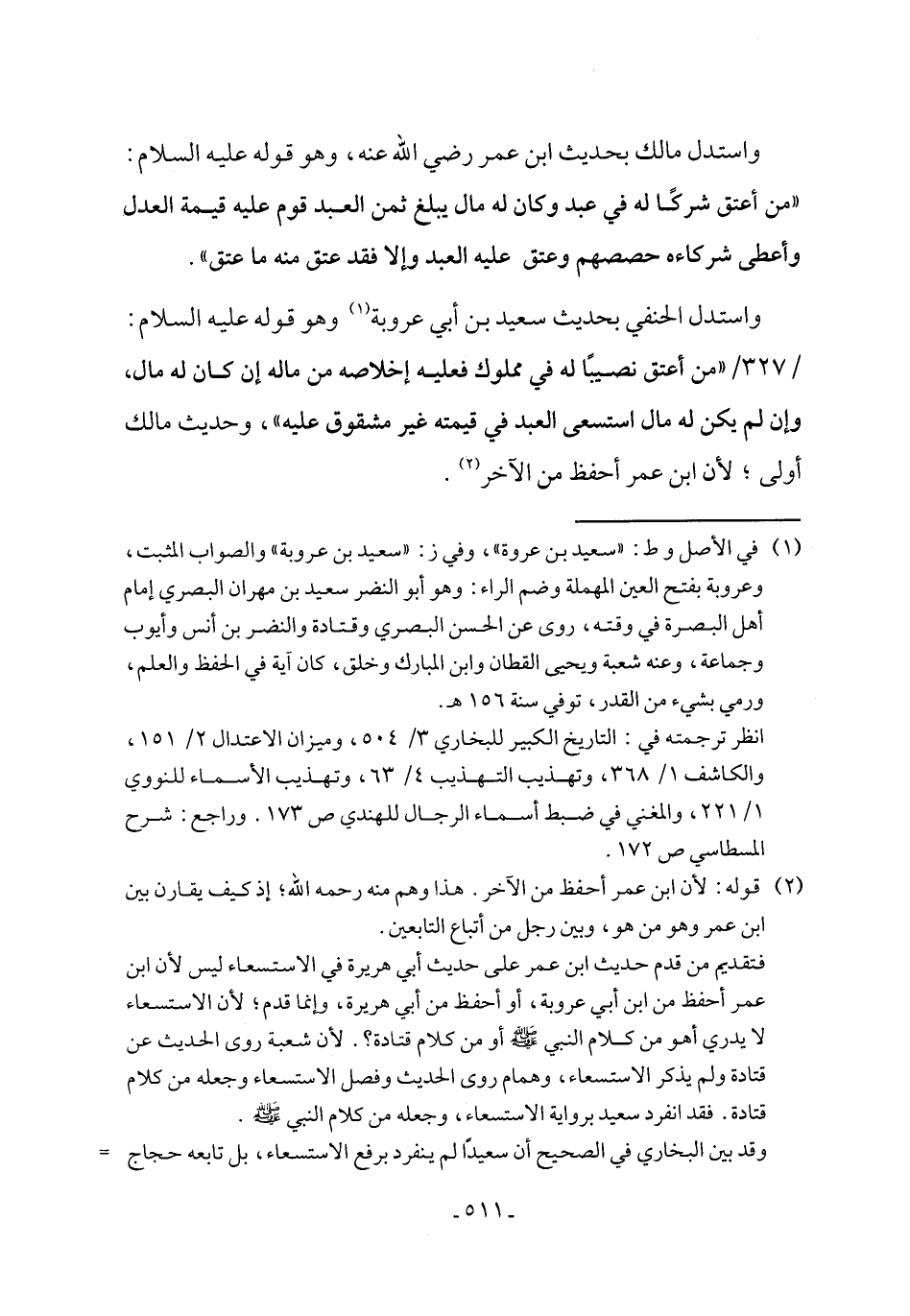 فتقديم من قدم حديث ابن عمر على حديث أبي هريرة في الاستسعاء ليس لأن ابن عمر أحفظ من ابن أبي عروبة، أو أحفظ من أبي هريرة، وإنما قدم؛ لأن الاستسعاء لا يدري أهو من كلام النبي - صلى الله عليه وسلم - أو من كلام قتادة؟. لأن شعبة روى الحديث عن قتادة ولم يذكر الاستسعاء، وهمام روى الحديث وفصل الاستسعاء وجعله من كلام قتادة. فقد انفرد سعيد برواية الاستسعاء، وجعله من كلام النبي - صلى الله عليه وسلم -.