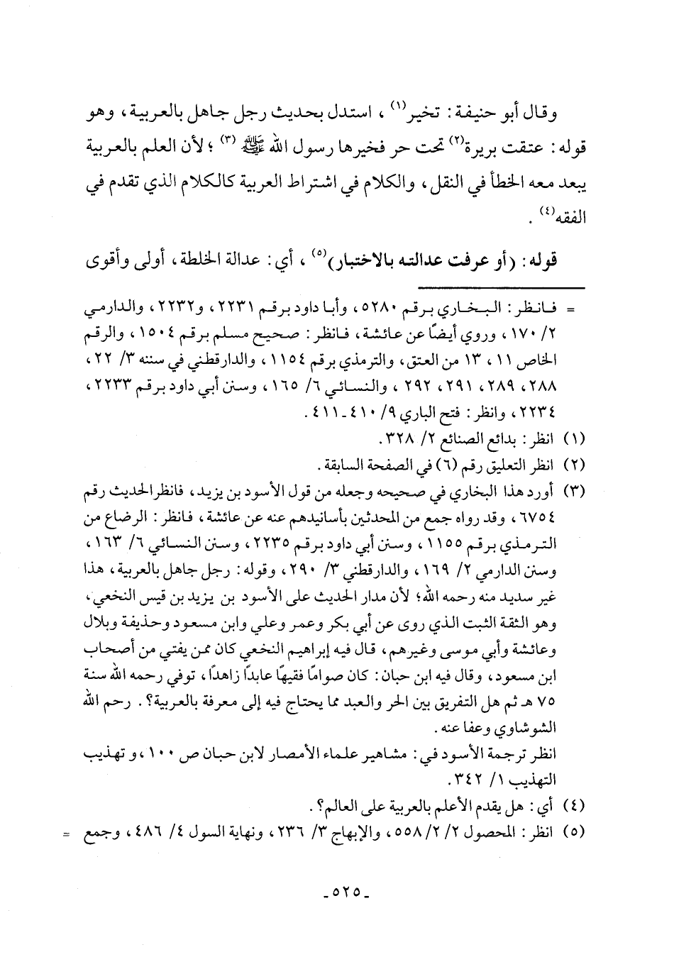 (¬3) أورد هذا البخاري في صحيحه وجعله من قول الأسود بن يزيد، فانظر الحديث رقم 6754، وقد رواه جمع من المحدثين بأسانيدهم عنه عن عائشة، فانظر: الرضاع من الترمذي برقم 1155، وسنن أبي داود برقم 2235، وسنن النسائي 6/ 163، وسنن الدارمي 2/ 169، والدارقطني 3/ 290، وقوله: رجل جاهل بالعربية، هذا غير سديد منه رحمه الله؛ لأن مدار الحديث على الأسود بن يزيد بن قيس النخعي، وهو الثقة الثبت الذي روى عن أبي بكر وعمر وعلي وابن مسعود وحذيفة وبلال وعائشة وأبي موسى وغيرهم، قال فيه إبراهيم النخعي كان ممن يفتي من أصحاب ابن مسعود، وقال فيه ابن حبان: كان صوامًا فقيهًا عابدًا زاهدًا، توفي رحمه الله سنة 75 هـ ثم هل التفريق بين الحر والعبد مما يحتاج فيه إلى معرفة بالعربية؟. رحم الله الشوشاوي وعفا عنه.