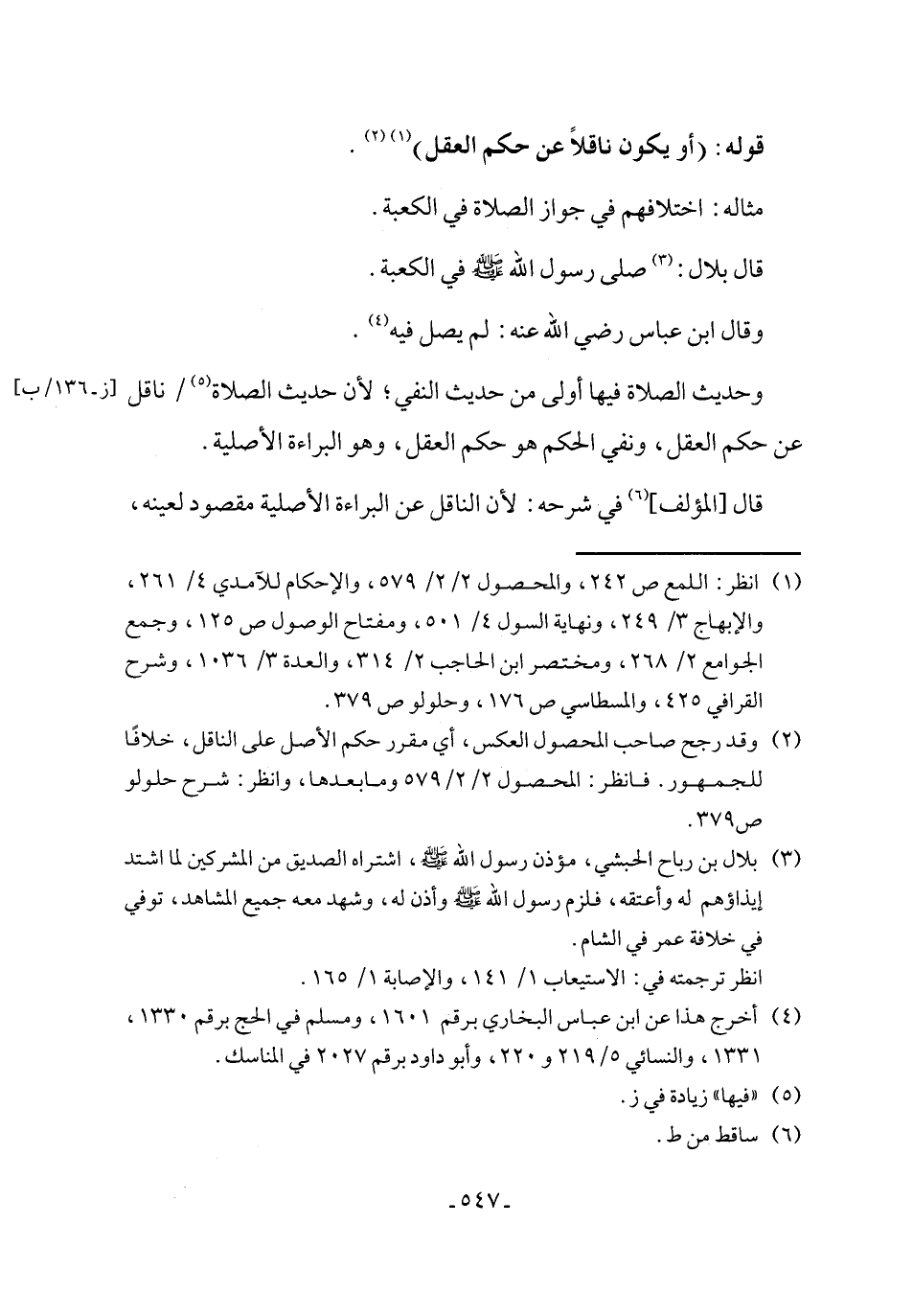 (¬2) وقد رجح صاحب المحصول العكس، أي مقرر حكم الأصل على الناقل، خلافًا للجمهور. فانظر: المحصول 2/ 2/ 579 وما بعدها، وانظر: شرح حلولو ص 379.
