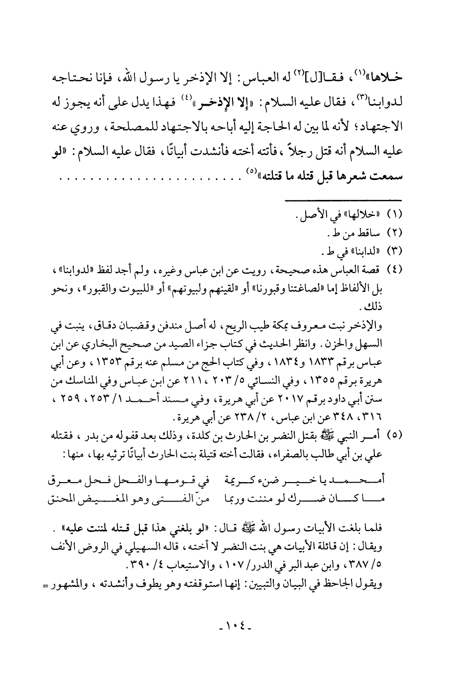 (¬4) قصة العباس هذه صحيحة، رويت عن ابن عباس وغيره، ولم أجد لفظ "لدوابنا"، بل الألفاظ إما "لصاغتنا وقبورنا" أو "لقينهم ولبيوتهم" أو "للبيوت والقبور"، ونحو ذلك.