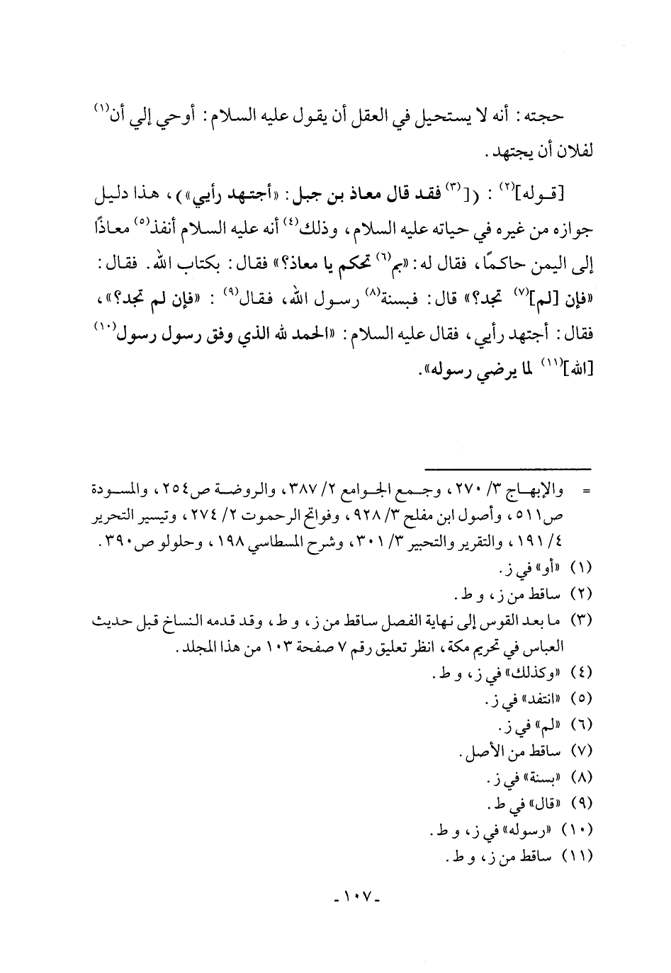 [قوله] (¬2): ([(¬3) فقد قال معاذ بن جبل: "أجتهد رأيي")، هذا دليل جوازه من غيره في حياته عليه السلام، وذلك (¬4) أنه عليه السلام أنفذ (¬5) معاذًا إلى اليمن حاكمًا، فقال له: "بم (¬6) تحكم يا معاذ؟ " فقال: بكتاب الله. فقال: "فإن [لم] (¬7) تجد؟ " قال: فبسنة (¬8) رسول الله، فقال (¬9): "فإن لم تجد؟ "، فقال: أجتهد رأيي، فقال عليه السلام: "الحمد لله الذي وفق رسول رسول (¬10) [الله] (¬11) لما يرضي رسوله".