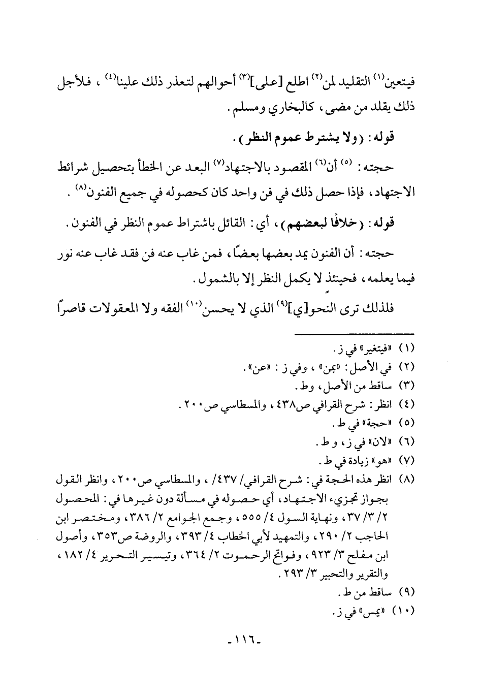 (¬8) انظر هذه الحجة في: شرح القرافي/ 437/، والمسطاسي ص 200، وانظر القول بجواز تجزيء الاجتهاد، أي حصوله في مسألة دون غيرها في: المحصول 2/ 3/ 37، ونهاية السول 4/ 555، وجمع الجوامع 2/ 386، ومختصر ابن الحاجب 2/ 290، والتمهيد لأبي الخطاب 4/ 393، والروضة ص 353، وأصول ابن مفلح 3/ 923، وفواتح الرحموت 2/ 364، وتيسير التحرير 4/ 182، والتقرير والتحبير 3/ 293.