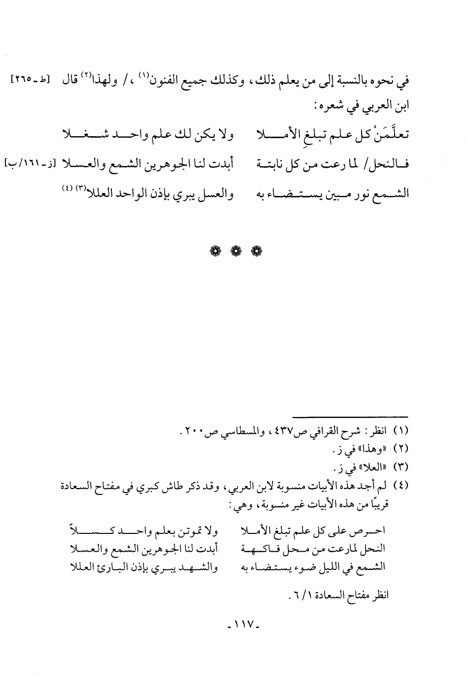 (¬4) لم أجد هذه الأبيات منسوبة لابن العربي، وقد ذكر طاش كبري في مفتاح السعادة قريبًا من هذه الأبيات غير منسوبة، وهي: