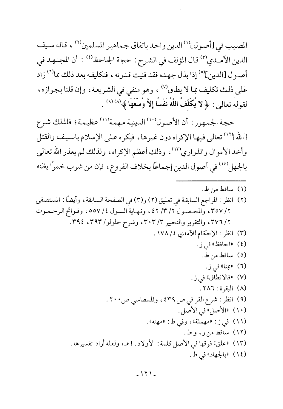 المصيب في [أصول] (¬1) الدين واحد باتفاق جماهير المسلمين (¬2)، قاله سيف الدين الآمدي (¬3) قال المؤلف في الشرح: حجة الجاحظ (¬4): أن المجتهد في أصول [الدين] (¬5) إذا بذل جهده فقد فنيت قدرته، فتكليفه بعد ذلك بما (¬6) زاد على ذلك تكليف بما لا يطاق (¬7)، وهو منفي في الشريعة، وإن قلنا بجوازه، لقوله تعالى: {لَا يُكَلِّفُ اللَّهُ نَفْسًا إلا وُسْعَهَا} (¬8) (¬9).