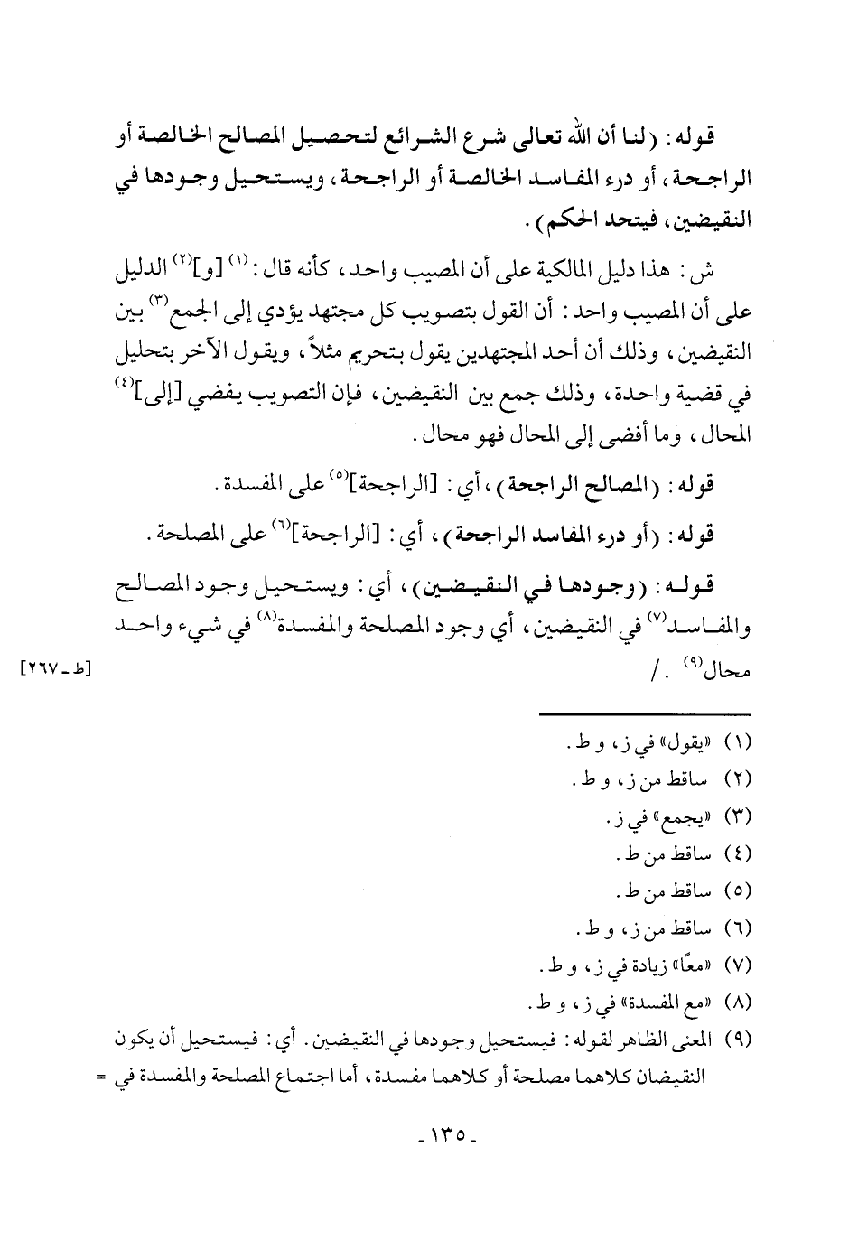 (¬9) المعنى الظاهر لقوله: فيستحيل وجودها في النقيضين. أي: فيستحيل أن يكون النقيضان كلاهما مصلحة أو كلاهما مفسدة، أما اجتماع المصلحة والمفسدة في =
