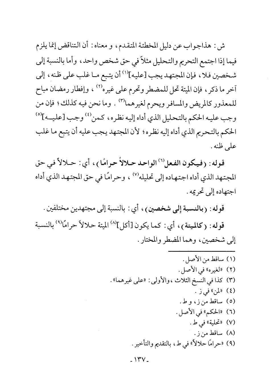 ش: هذا جواب عن دليل المخطئة المتقدم، ومعناه: أن التناقض إنما يلزم فيما إذا اجتمع التحريم والتحليل مثلاً في حق شخص واحد، وأما بالنسبة إلى شخصين فلا، فإن المجتهد يجب [عليه] (¬1) أن يتبع ما غلب على ظنه، إلى آخر ما ذكر، فإن الميتة تحل للمضطر وتحرم على غيره (¬2)، وإفطار رمضان مباح للمعذور كالمريض والمسافر ويحرم لغيرهما (¬3). وما نحن فيه كذلك؛ فإن من وجب عليه الحكم بالتحليل الذي أداه إليه نظره، كمن (¬4) وجب [عليه] (¬5) الحكم بالتحريم الذي أداه إليه نظره؛ لأن المجتهد يجب عليه أن يتبع ما غلب على ظنه.