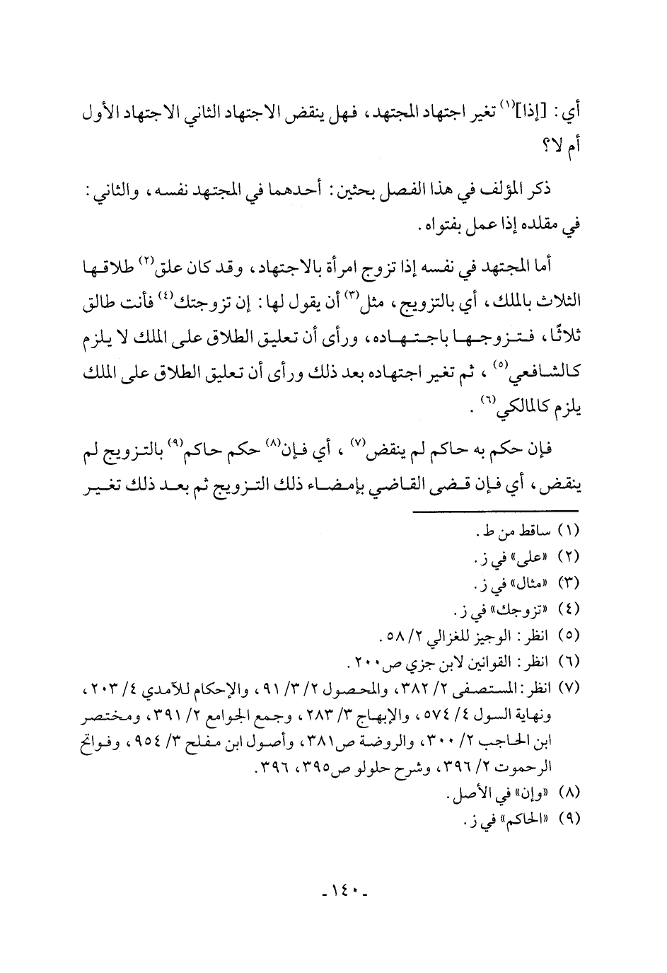 أما المجتهد في نفسه إذا تزوج امرأة بالاجتهاد، وقد كان علق (¬2) طلاقها الثلاث بالملك، أي بالتزويج، مثل (¬3) أن يقول لها: إن تزوجتك (¬4) فأنت طالق ثلاثًا، فتزوجها باجتهاده، ورأى أن تعليق الطلاق على الملك لا يلزم كالشافعي (¬5)، ثم تغير اجتهاده بعد ذلك ورأى أن تعليق الطلاق على الملك يلزم كالمالكي (¬6).