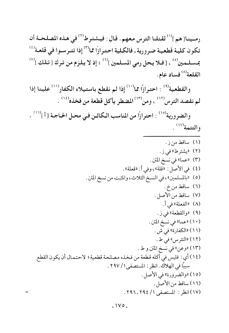 والقطعية (¬9): احترازًا مما (¬10) إِذا لم نقطع باستيلاء الكفار (¬11) علينا إذا لم نقصد الترس (¬12)، ومن (¬13) المضطر يأكل قطعة من فخذه (¬14).