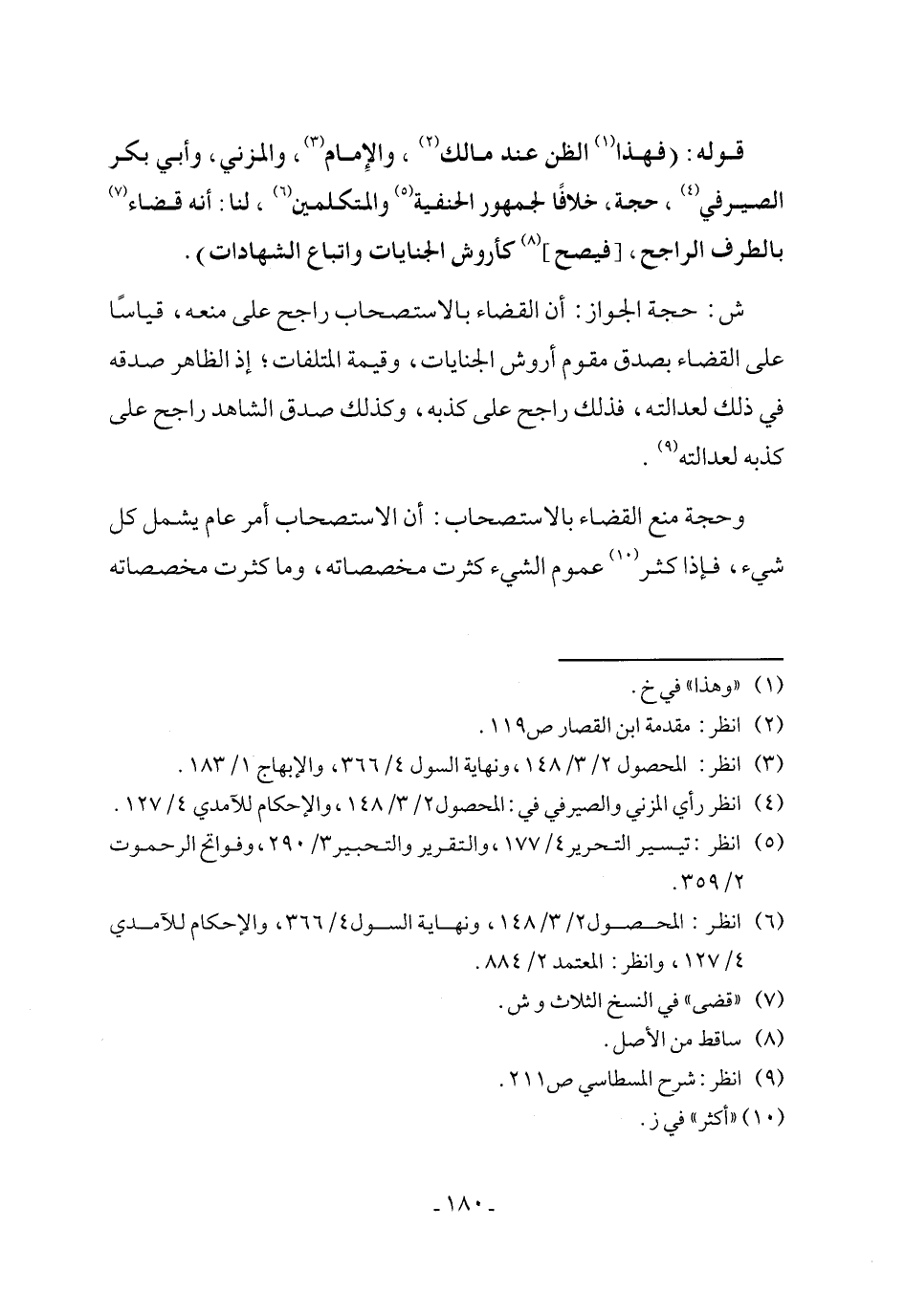 ش: حجة الجواز: أن القضاء بالاستصحاب راجح على منعه، قياسًا على القضاء بصدق مقوم أروش الجنايات، وقيمة المتلفات؛ إذ الظاهر صدقه في ذلك لعدالته، فذلك راجح على كذبه، وكذلك صدق الشاهد راجح على كذبه لعدالته (¬9).