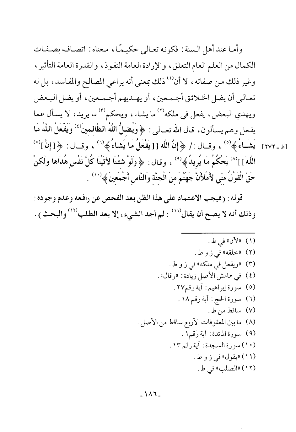وأما عند أهل السنة: فكونه تعالى حكيمًا، معناه: اتصافه بصفات الكمال من العلم العام التعلق، والإرادة العامة النفوذ، والقدرة العامة التأثير، وغير ذلك من صفاته، لا أن (¬1) ذلك بمعنى أنه يراعي المصالح والمفاسد، بل له تعالى أن يضل الخلائق أجمعين، أو يهديهم أجمعين، أو يضل البعض ويهدي البعض، يفعل في ملكه (¬2) ما يشاء، ويحكم (¬3) ما يريد، لا يسأل عما يفعل وهم يسألون، قال الله تعالى: {وَيُضِلُّ اللَّهُ الظَّالِمِينَ (¬4) وَيَفْعَلُ اللَّهُ مَا يَشَاءُ} (¬5)، وقال: {إِنَّ اللَّهَ [[يَفْعَلُ مَا يَشَاءُ} (¬6)، وقال: {[إِنَّ] (¬7) اللَّهَ]] (¬8) يَحْكُمُ مَا يُرِيدُ} (¬9)، وقال: {وَلَوْ شِئْنَا لَآتَيْنَا كُلَّ نَفْسٍ هُدَاهَا وَلَكِنْ حَقَّ الْقَوْلُ مِنِّي لَأَمْلَأَنَّ جَهَنَّمَ مِنَ الْجِنَّةِ وَالنَّاسِ أَجْمَعِينَ} (¬10).