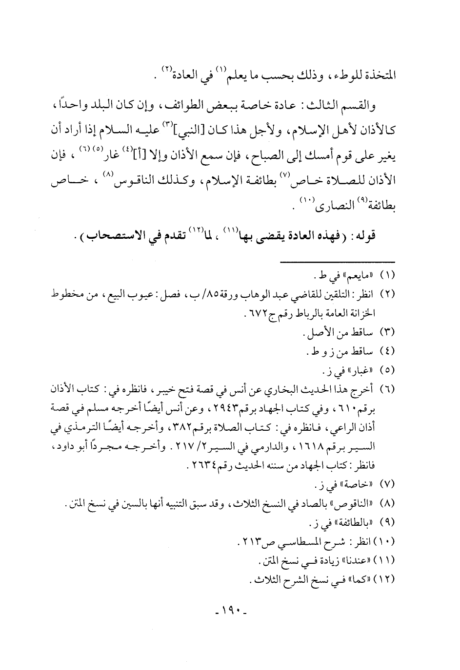 والقسم الثالث: عادة خاصة ببعض الطوائف، وإن كان البلد واحدًا، كالأذان لأهل الإسلام، ولأجل هذا كان [النبي] (¬3) عليه السلام إذا أراد أن يغير على قوم أمسك إلى الصباح، فإن سمع الأذان وإلا [أ] (¬4) غار (¬5) (¬6)، فإن الأذان للصلاة خاص (¬7) بطائفة الإسلام، وكذلك الناقوس (¬8)، خاص بطائفة (¬9) النصارى (¬10).
