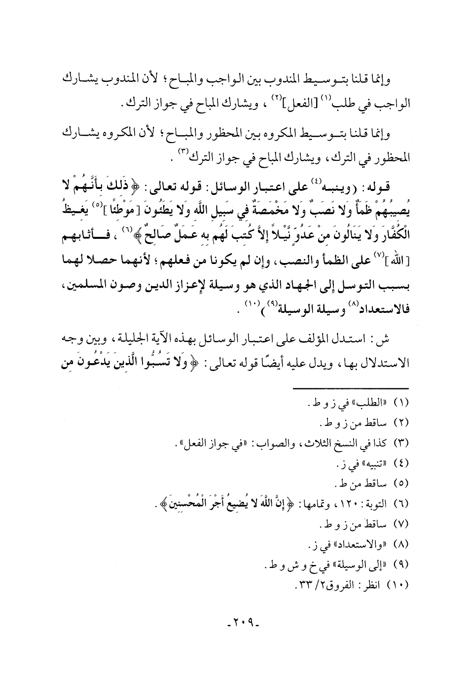 قوله: (وينبه (¬4) على اعتبار الوسائل: قوله تعالى: {ذَلِكَ بِأَنَّهُمْ لَا يُصِيبُهُمْ ظَمَأٌ وَلَا نَصَبٌ وَلَا مَخْمَصَةٌ فِي سَبِيلِ اللَّهِ وَلَا يَطَئُونَ [مَوْطِئًا] (¬5) يَغِيظُ الْكُفَّارَ وَلَا يَنَالُونَ مِنْ عَدُوٍّ نَيْلًا إلا كُتِبَ لَهُمْ بِهِ عَمَلٌ صَالِحٌ} (¬6)، فأثابهم [الله] (¬7) على الظمأ والنصب، وإِن لم يكونا من فعلهم؛ لأنهما حصلا لهما بسبب التوسل إِلى الجهاد الذي هو وسيلة لإِعزاز الدين وصون المسلمين، فالاستعداد (¬8) وسيلة الوسيلة (¬9)) (¬10).