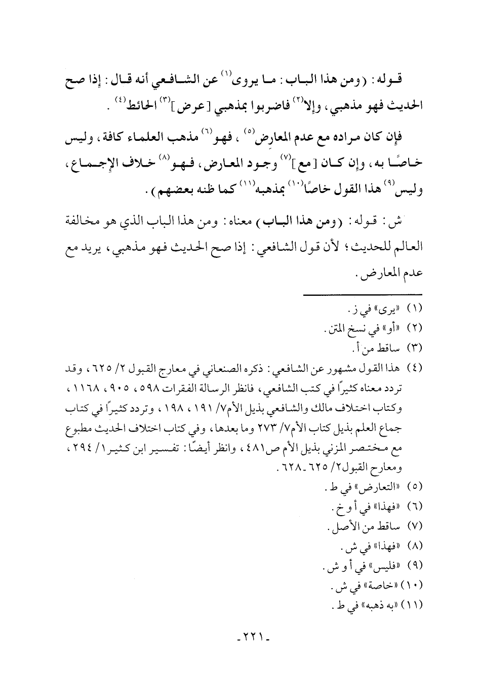 (¬4) هذا القول مشهور عن الشافعي: ذكره الصنعاني في معارج القبول 2/ 625، وقد تردد معناه كثيرًا في كتب الشافعي، فانظر الرسالة الفقرات 598، 905، 1168، وكتاب اختلاف مالك والشافعي بذيل الأم 7/ 191، 198، وتردد كثيرًا في كتاب جماع العلم بذيل كتاب الأم 7/ 273 وما بعدها، وفي كتاب اختلاف الحديث مطبوع مع مختصر المزني بذيل الأم ص 481، وانظر أيضًا: تفسير ابن كثير 1/ 294، ومعارح القبول 2/ 625 - 628.