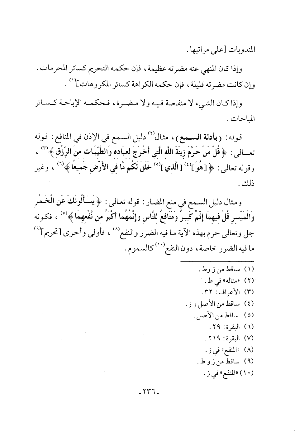 قوله: (بأدلة السمع)، مثال (¬2) دليل السمع في الإذن في المنافع: قوله تعالى: {قُلْ مَنْ حَرَّمَ زِينَةَ اللَّهِ الَّتِي أَخْرَج لعِبَادِهِ وَالطَّيِّبَاتِ مِنَ الرِّزْقِ} (¬3)، وقوله تعالى: {[هُوَ] (¬4) [الَّذِي] (¬5) خَلَقَ لَكُمَ مَّا فِي الأَرْض جَمِيعًا} (¬6)، وغير ذلك.