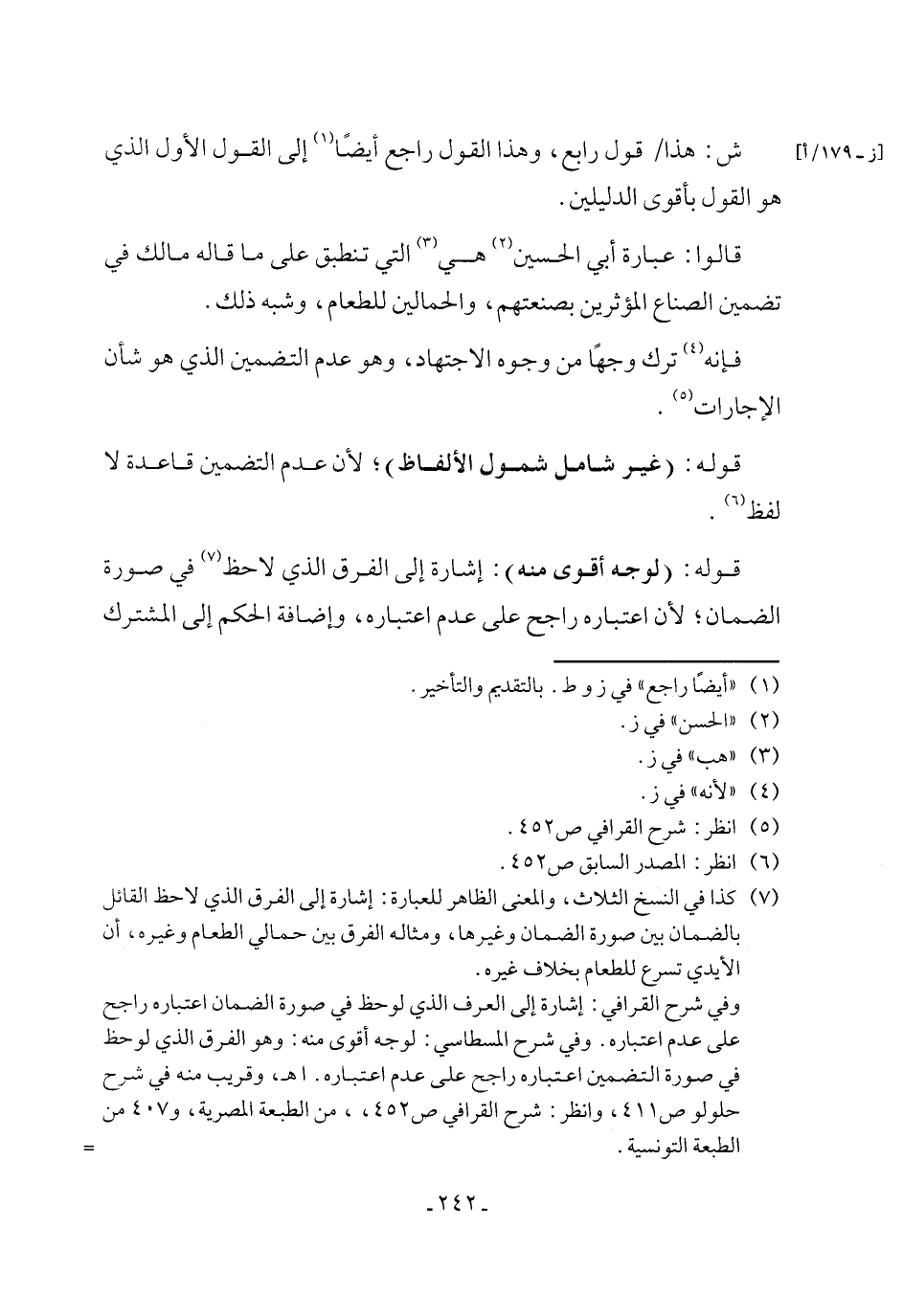 وفي شرح القرافي: إشارة إلى العرف الذي لوحظ في صورة الضمان اعتباره راجح على عدم اعتباره. وفي شرح المسطاسي: لوجه أقوى منه: وهو الفرق الذي لوحظ في صورة التضمين اعتباره راجح على عدم اعتباره. اهـ، وقريب منه في شرح حلولو ص 411، وانظر: شرح القرافي ص 452،، من الطبعة المصرية، و407 من الطبعة التونسية. =