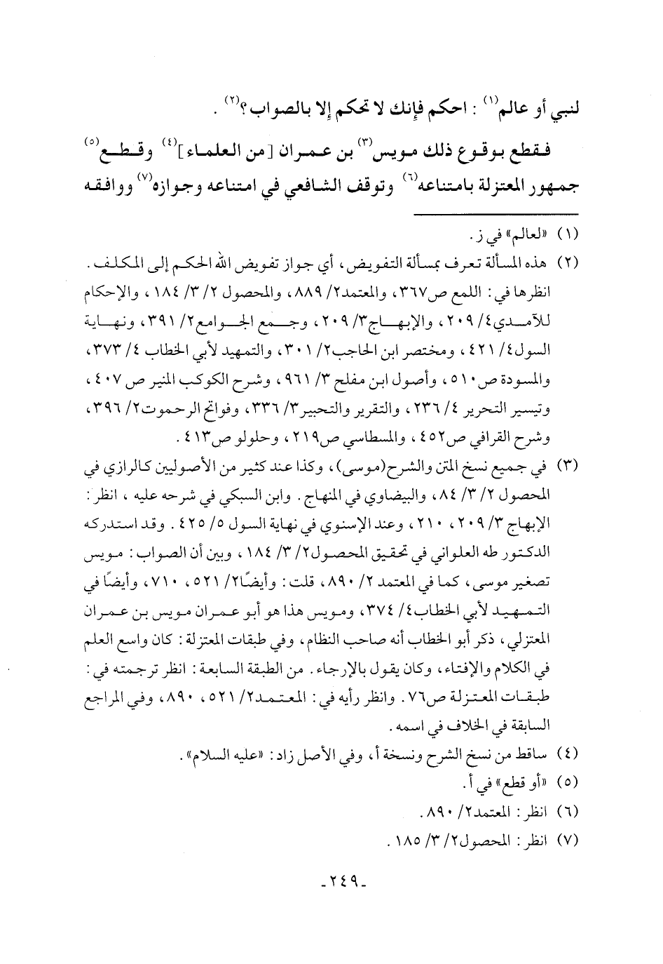 (¬2) هذه المسألة تعرف بمسألة التفويض، أي جواز تفويض الله الحكم إلى المكلف. انظرها في: اللمع ص 367، والمعتمد 2/ 889، والمحصول 2/ 3/ 184، والإحكام للآمدي 4/ 209، والإبهاج 3/ 209، وجمع الجوامع 2/ 391، ونهاية السول 4/ 421، ومختصر ابن الحاجب 2/ 301، والتمهيد لأبي الخطاب 4/ 373، والمسودة ص 510، وأصول ابن مفلح 3/ 961، وشرح الكوكب المنير ص 407، وتيسير التحرير 4/ 236، والتقرير والتحبير 3/ 336، وفواتح الرحموت 2/ 396، وشرح القرافي ص 452، والمسطاسي ص 219، وحلولو ص 413.