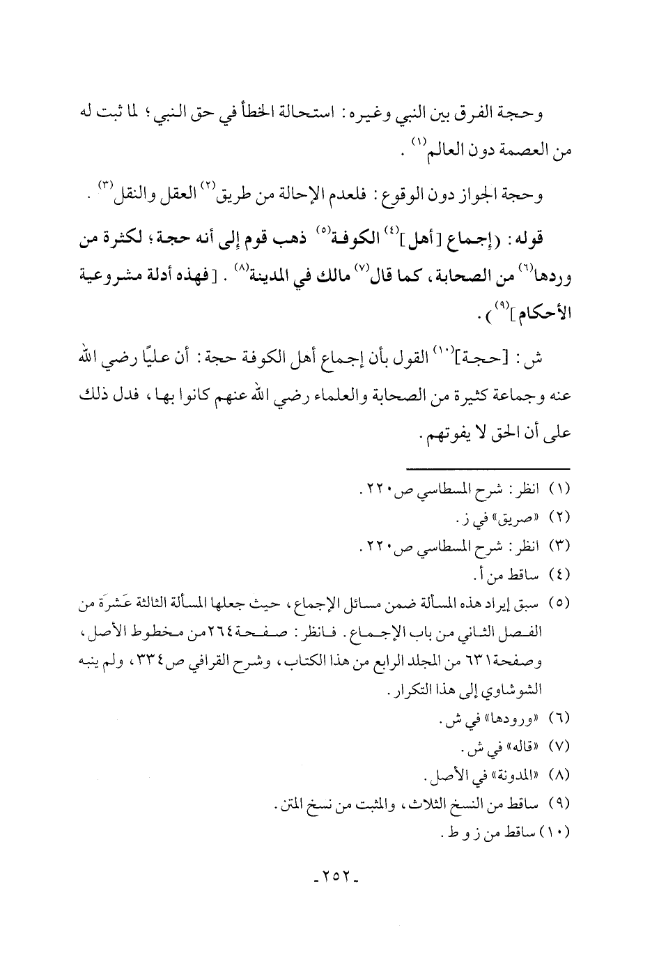 ش: [حجة] (¬10) القول بأن إجماع أهل الكوفة حجة: أن عليًا رضي الله عنه وجماعة كثيرة من الصحابة والعلماء رضي الله عنهم كانوا بها، فدل ذلك على أن الحق لا يفوتهم.
