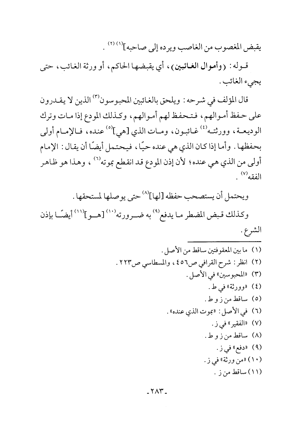 قال المؤلف في شرحه: ويلحق بالغائبين المحبوسون (¬3) الذين لا يقدرون على حفظ أموالهم، فتحفظ لهم أموالهم، وكذلك المودع إذا مات وترك الوديعة، وورثته (¬4) غائبون، ومات الذي [هي] (¬5) عنده، فالإمام أولى بحفظها. وأما إذا كان الذي هي عنده حيًا، فيحتمل أيضًا أن يقال: الإمام أولى من الذي هي عنده؛ لأن إذن المودع قد انقطع بموته (¬6)، وهذا هو ظاهر الفقه (¬7).