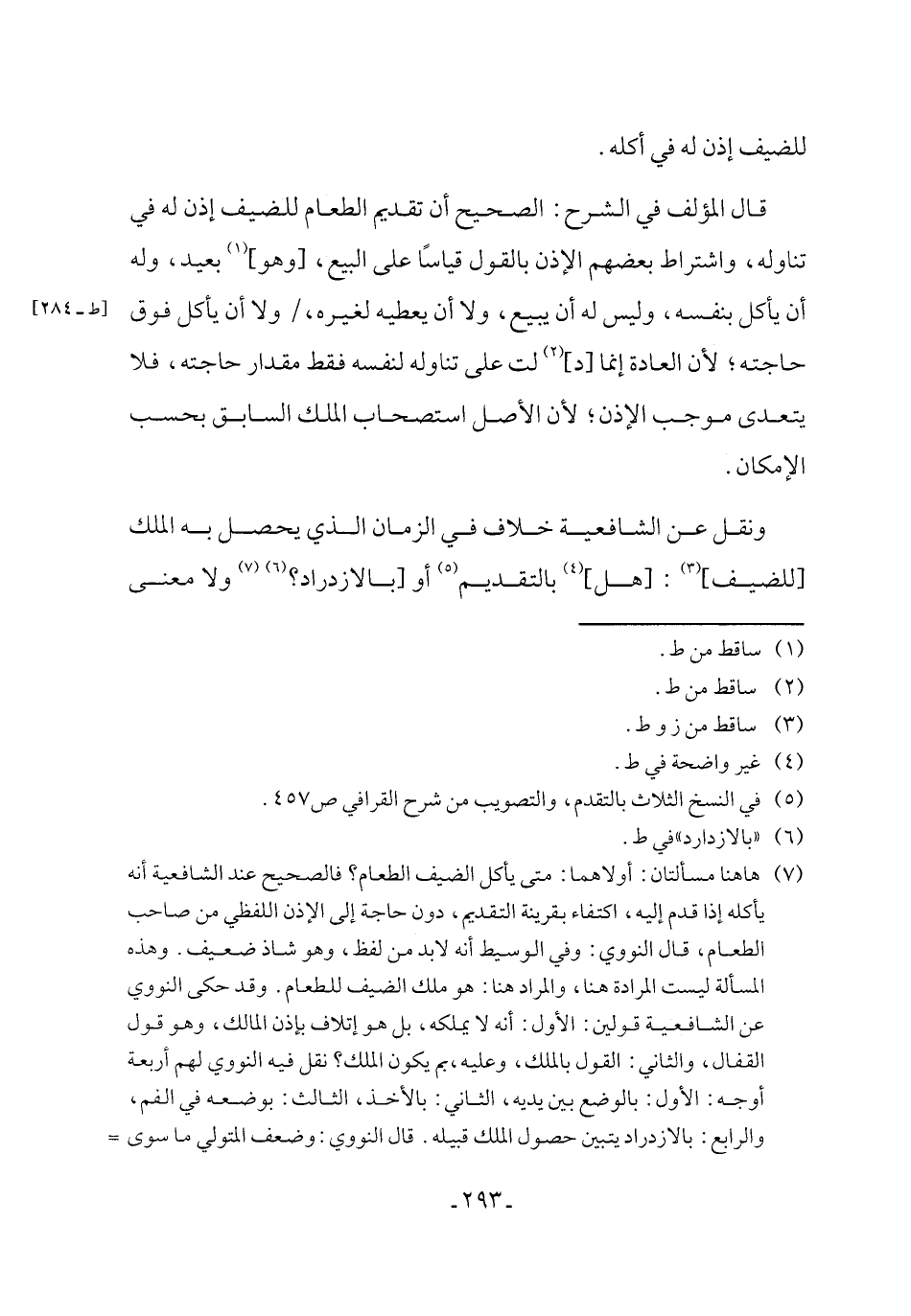 (¬7) ها هنا مسألتان: أولاهما: متى يأكل الضيف الطعام؟ فالصحيح عند الشافعية أنه يأكله إذا قدم إليه، اكتفاء بقرينة التقديم، دون حاجة إلى الإذن اللفظي من صاحب الطعام، قال النووي: وفي الوسيط أنه لا بد من لفظ، وهو شاذ ضعيف. وهذه المسألة ليست المرادة هنا، والمراد هنا: هو ملك الضيف للطعام. وقد حكى النووي عن الشافعية قولين: الأول: أنه لا يملكه، بل هو إتلاف بإذن المالك، وهو قول القفال، والثاني: القول بالملك، وعليه، بم يكون الملك؟ نقل فيه النووي لهم أربعة أوجه: الأول: بالوضع بين يديه، الثاني: بالأخذ، الثالث: بوضعه في الفم، والرابع: بالازدراد يتبين حصول الملك قبيله. قال النووي: وضعف المتولي ما سوى =