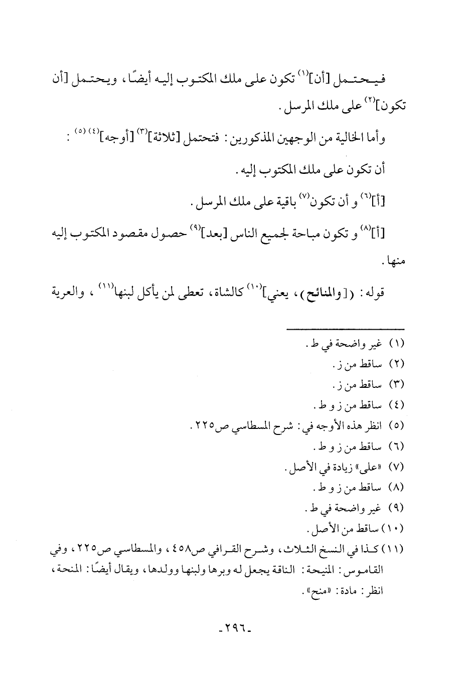 (¬11) كذا في النسخ الثلاث، وشرح القرافي ص 458، والمسطاسي ص 225، وفي القاموس: المنيحة: الناقة يجعل له وبرها ولبنها وولدها، ويقال أيضًا: المنحة، انظر: مادة: "منح".