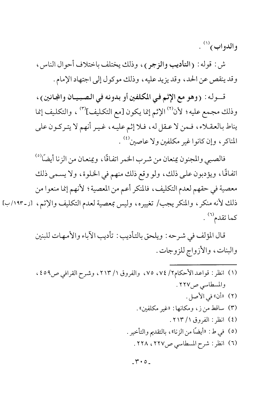 قوله: (وهو مع الإِثم في المكلفين أو بدونه في الصبيان والمجانين)، وذلك مجمع عليه؛ لأن (¬2) الإثم إنما يكون [مع التكليف] (¬3)، والتكليف إنما يناط بالعقلاء، فمن لا عقل له، فلا إثم عليه، غير أنهم لا يتركون على المناكر، وإن كانوا غير مكلفين ولا عاصين (¬4).