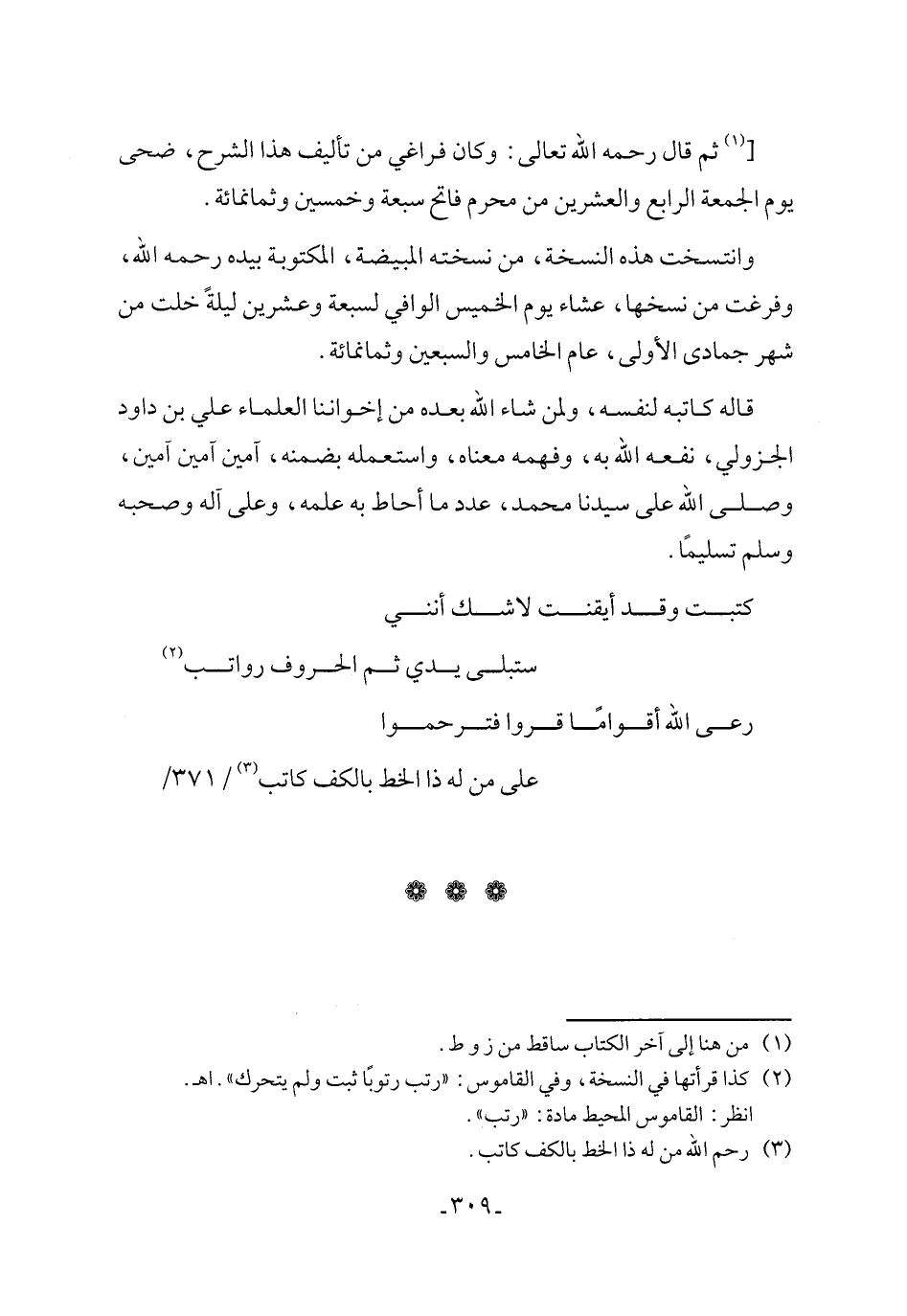 قاله كاتبه لنفسه، ولمن شاء الله بعده من إخواننا العلماء علي بن داود الجزولي، نفعه الله به، وفهمه معناه، واستعمله بضمنه، آمين آمين آمين، وصلى الله على سيدنا محمد، عدد ما أحاط به علمه، وعلى آله وصحبه وسلم تسليمًا.