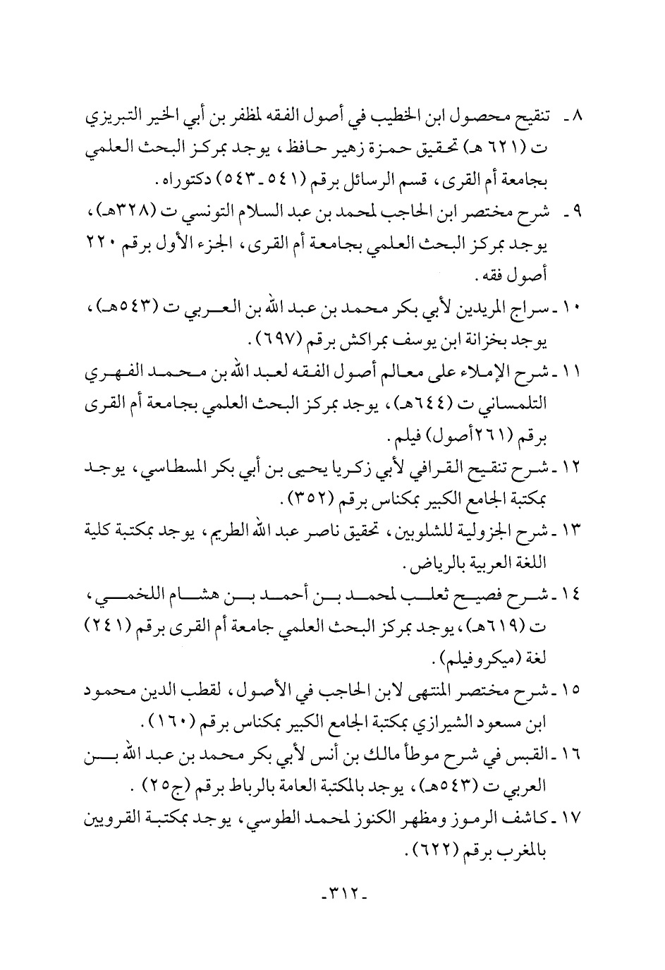 12 - شرح تنقيح القرافي لأبي زكريا يحيى بن أبي بكر المسطاسي، يوجد بمكتبة الجامع الكبير بمكناس برقم (352).