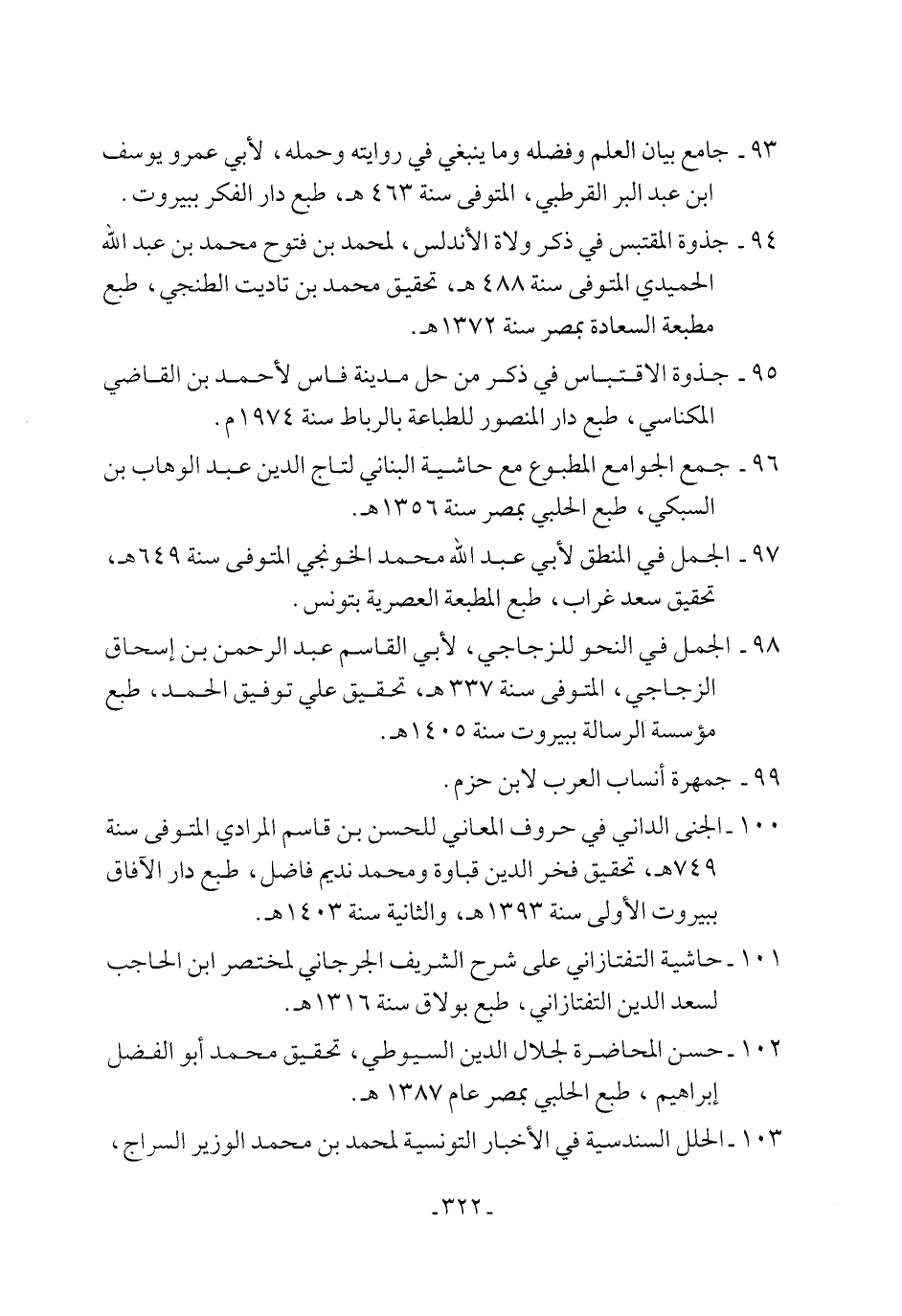 100 - الجنى الداني في حروف المعاني للحسن بن قاسم المرادي المتوفى سنة 749 هـ، تحقيق فخر الدين قباوة ومحمد نديم فاضل، طبع دار الآفاق ببيروت الأولى سنة 1393 هـ، والثانية سنة 1403 هـ.