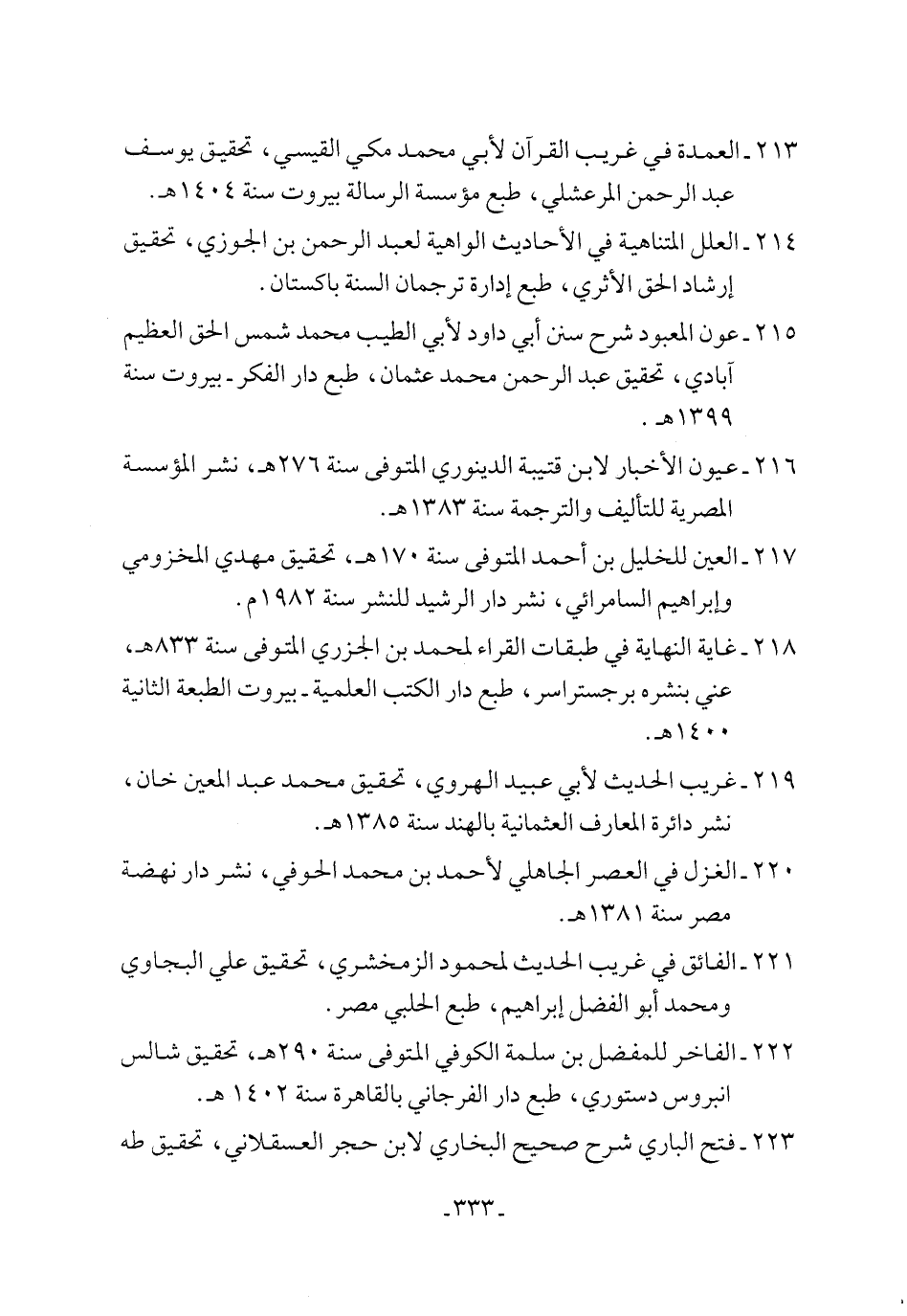 219 - غريب الحديث لأبي عبيد الهروي، تحقيق محمد عبد المعين خان، نشر دائرة المعارف العثمانية بالهند سنة 1385 هـ.