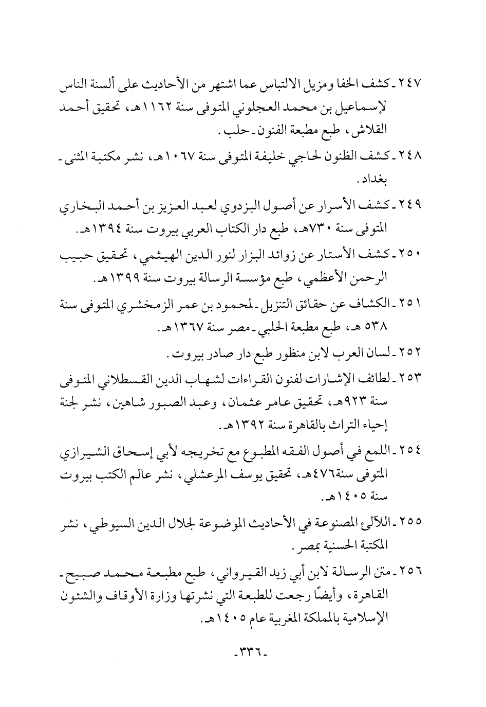 247 - كشف الخفا ومزيل الالتباس عما اشتهر من الأحاديث على ألسنة الناس لإسماعيل بن محمد العجلوني المتوفى سنة 1162 هـ، تحقيق أحمد القلاش، طبع مطبعة الفنون - حلب.