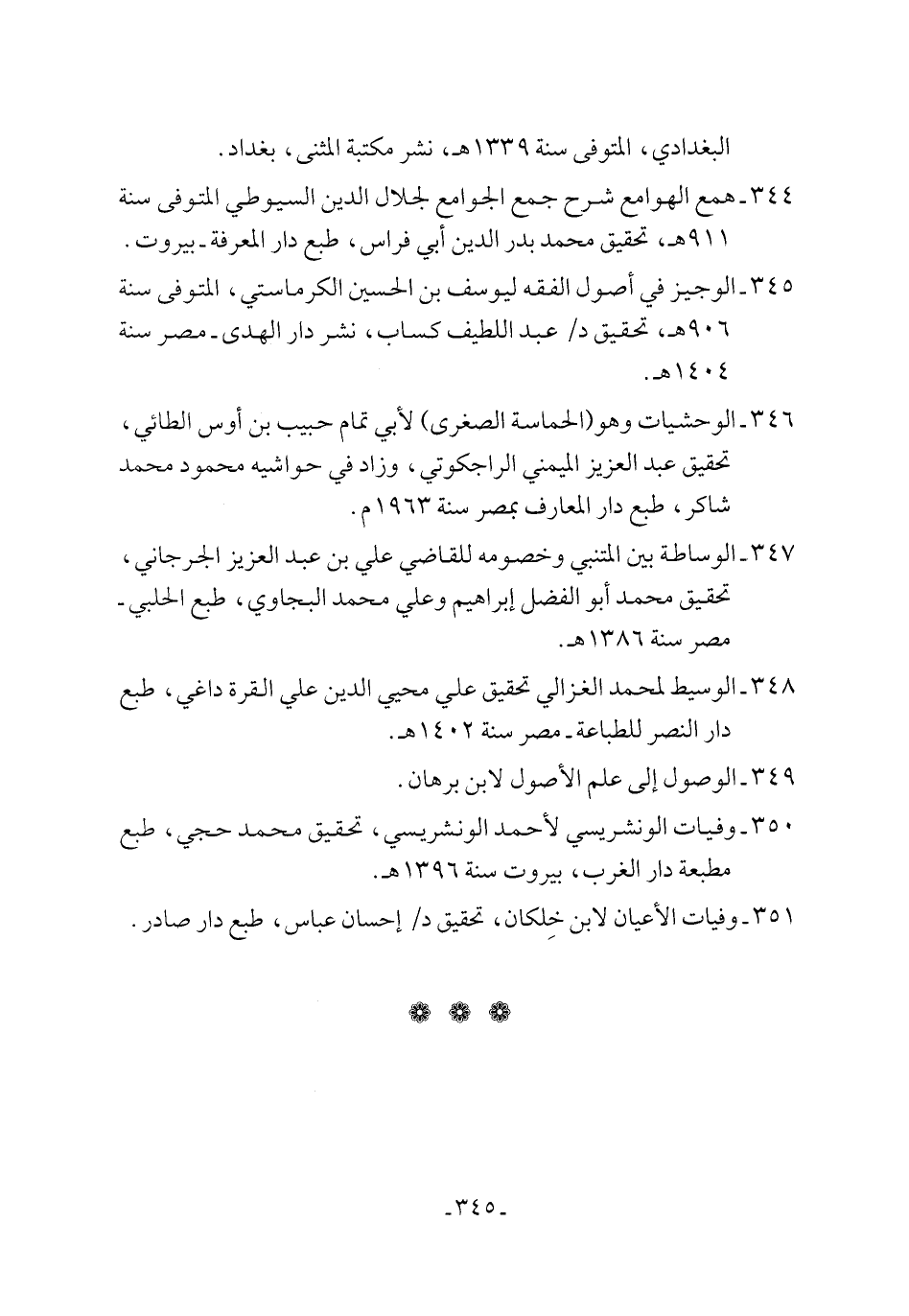 346 - الوحشيات وهو (الحماسة الصغرى) لأبي تمام حبيب بن أوس الطائي، تحقيق عبد العزيز الميمني الراجكوتي، وزاد في حواشيه محمود محمد شاكر، طبع دار المعارف بمصر سنة 1963 م.