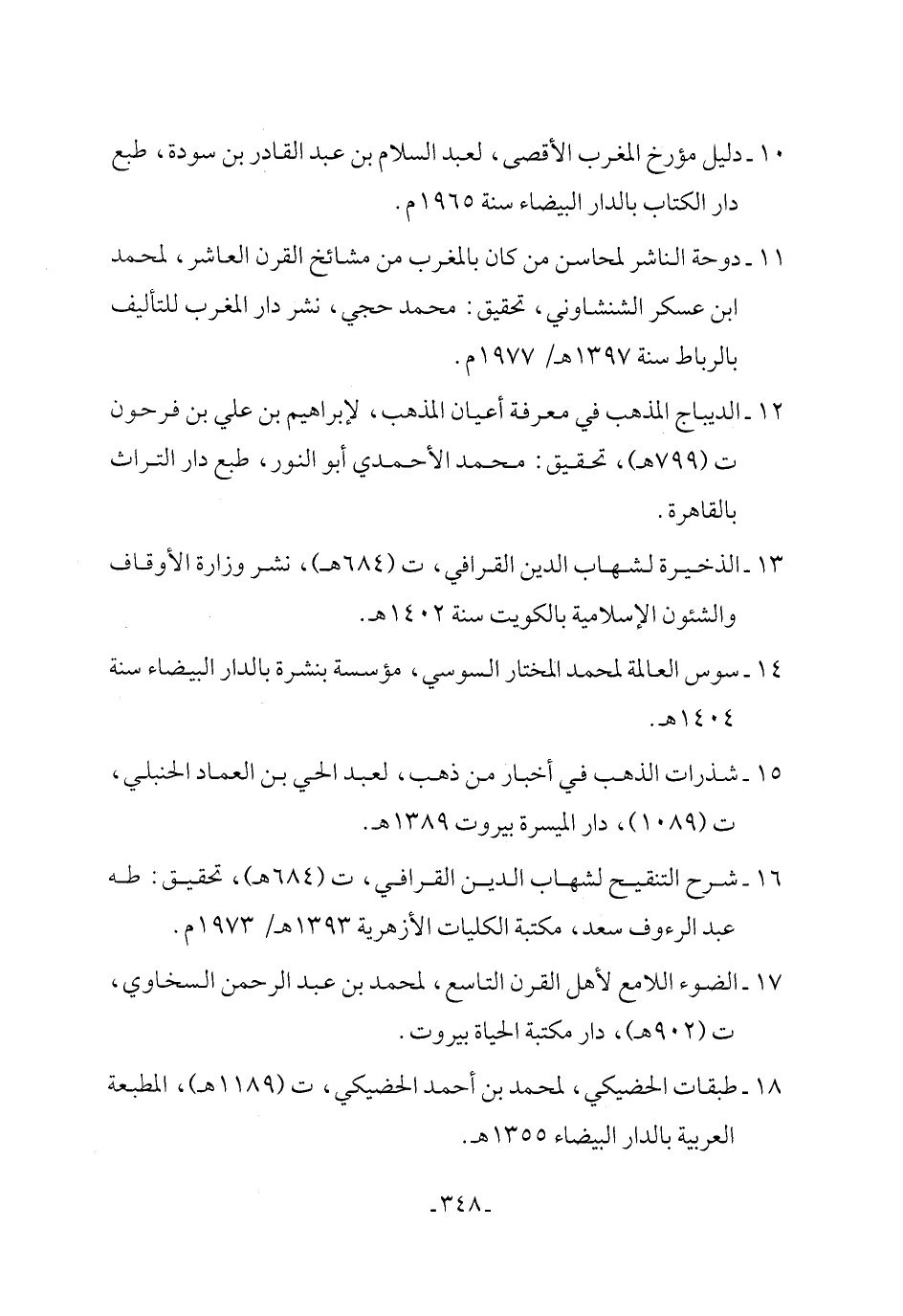 11 - دوحة الناشر لمحاسن من كان بالمغرب من مشائخ القرن العاشر، لمحمد ابن عسكر الشنشاوني، تحقيق: محمد حجي، نشر دار المغرب للتأليف بالرباط سنة 1397 هـ/ 1977 م.