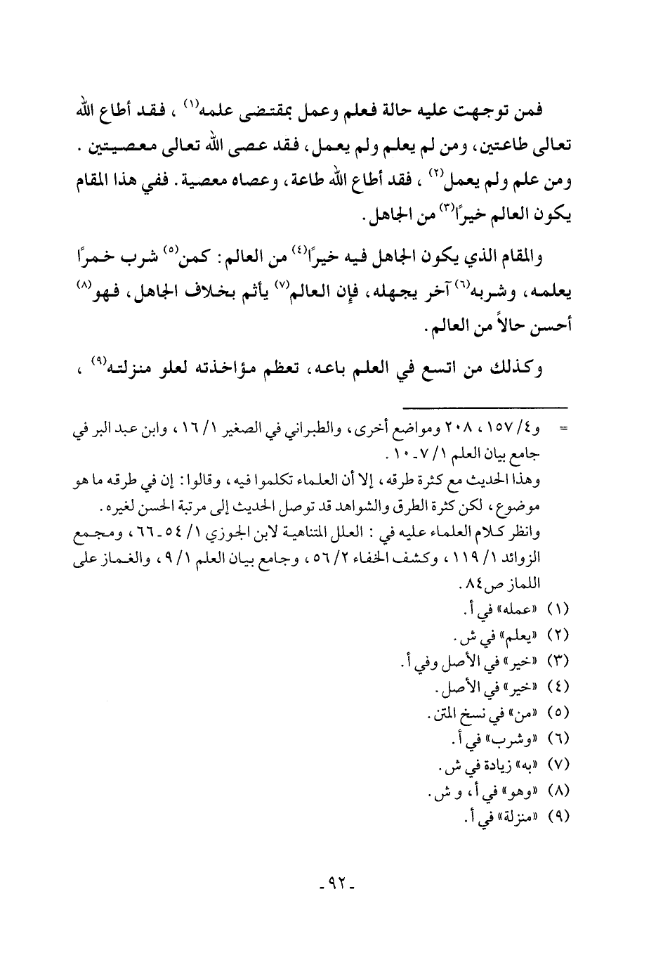 فمن توجهت عليه حالة فعلم وعمل بمقتضى علمه (¬1)، فقد أطاع الله تعالى طاعتين، ومن لم يعلم ولم يعمل، فقد عصى الله تعالى معصيتين. ومن علم ولم يعمل (¬2)، فقد أطاع الله طاعة، وعصاه معصية. ففي هذا المقام يكون العالم خيرًا (¬3) من الجاهل.