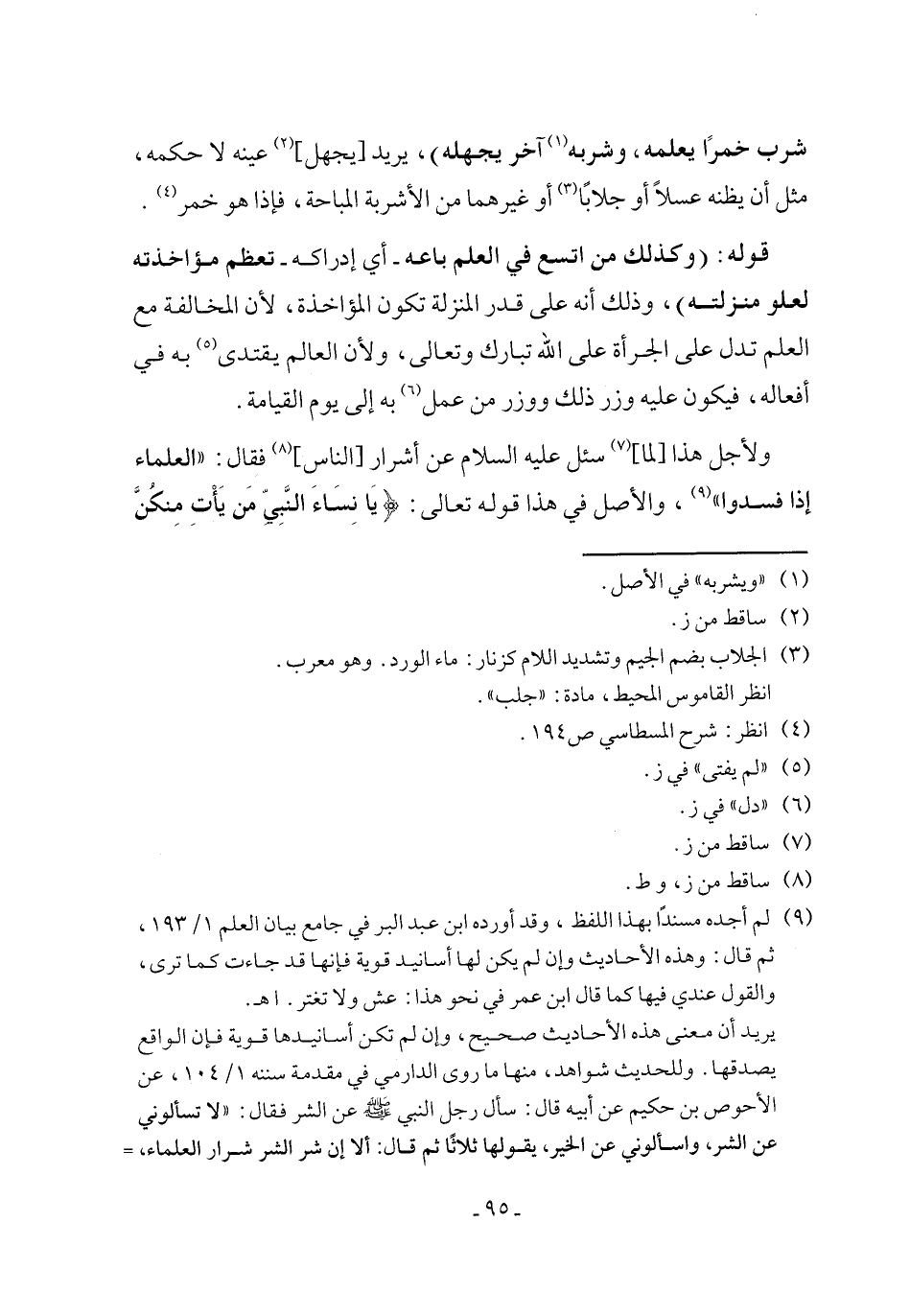 قوله: (وكذلك من اتسع في العلم باعه - أي إدراكه - تعظم مؤاخذته لعلو منزلته)، وذلك أنه على قدر المنزلة تكون المؤاخذة، لأن المخالفة مع العلم تدل على الجرأة على الله تبارك وتعالى، ولأن العالم يقتدى (¬5) به في أفعاله، فيكون عليه وزر ذلك ووزر من عمل (¬6) به إلى يوم القيامة.