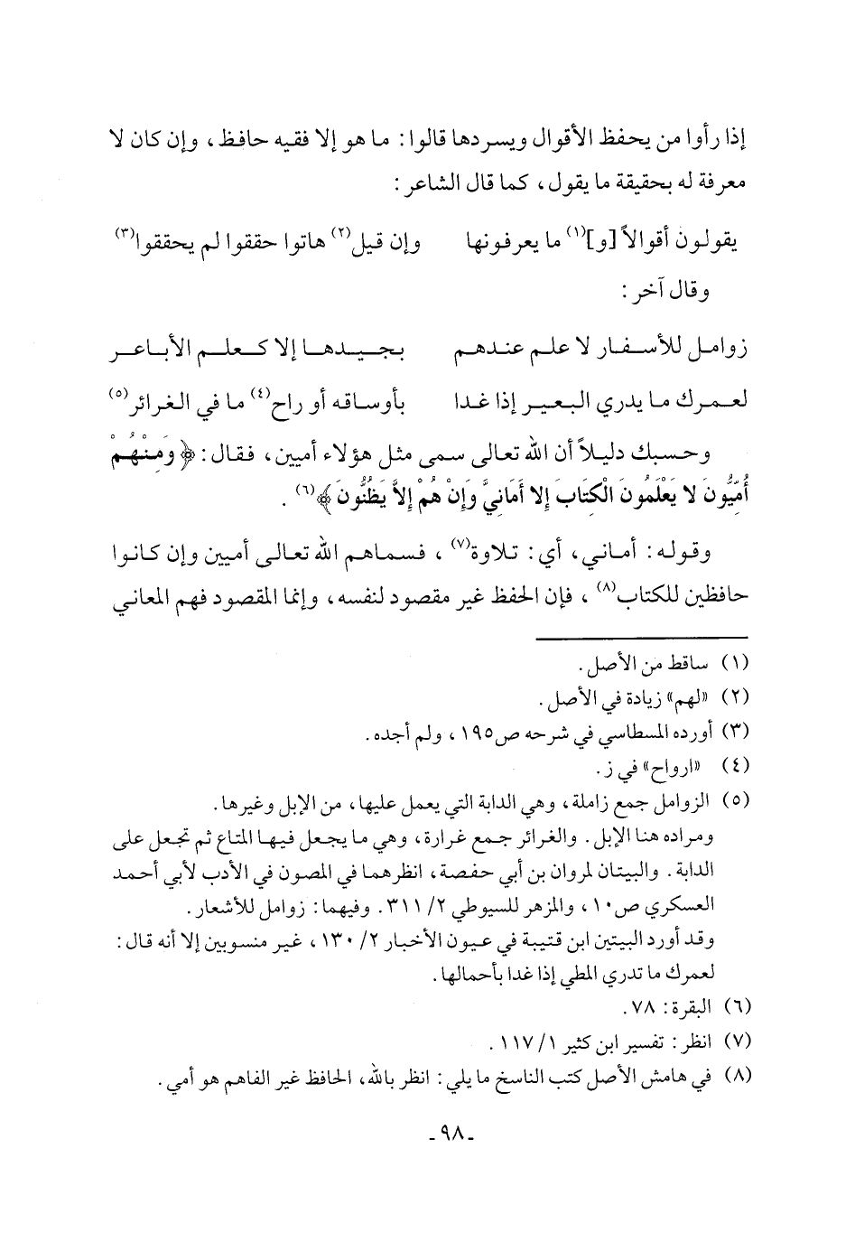 إذا رأوا من يحفظ الأقوال ويسردها قالوا: ما هو إلا فقيه حافظ، وإن كان لا معرفة له بحقيقة ما يقول، كما قال الشاعر: