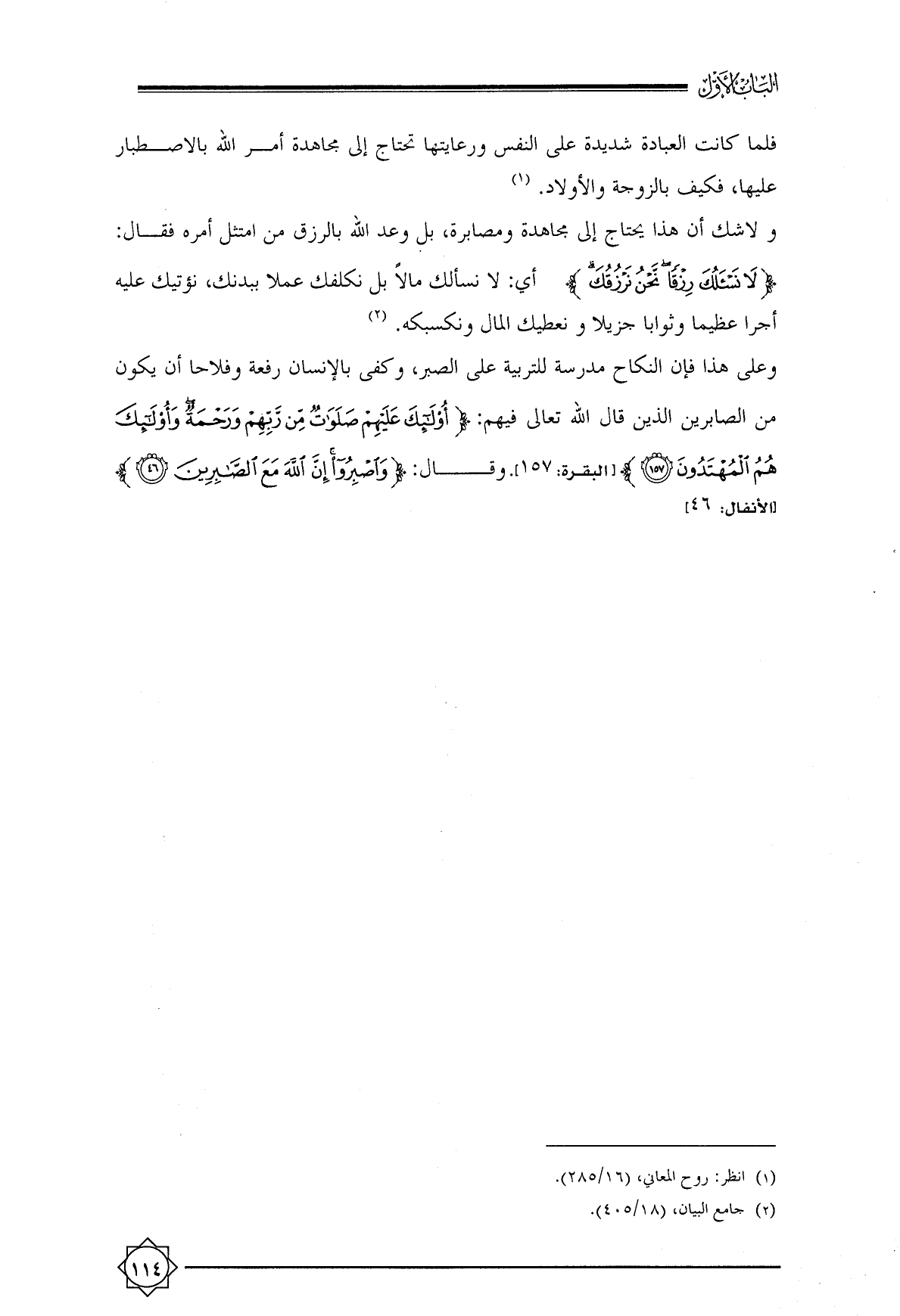 وعلى هذا فإن النكاح مدرسة للتربية على الصبر, وكفى بالإنسان رفعة وفلاحا أن يكون من الصابرين الذين قال الله تعالى فيهم: {أُولَئِكَ عَلَيْهِمْ صَلَوَاتٌ مِنْ رَبِّهِمْ وَرَحْمَةٌ وَأُولَئِكَ هُمُ الْمُهْتَدُونَ (١٥٧)} [البقرة: ١٥٧]. وقال: {وَاصْبِرُوا إِنَّ اللَّهَ مَعَ الصَّابِرِينَ (٤٦)} [الأنفال: ٤٦]