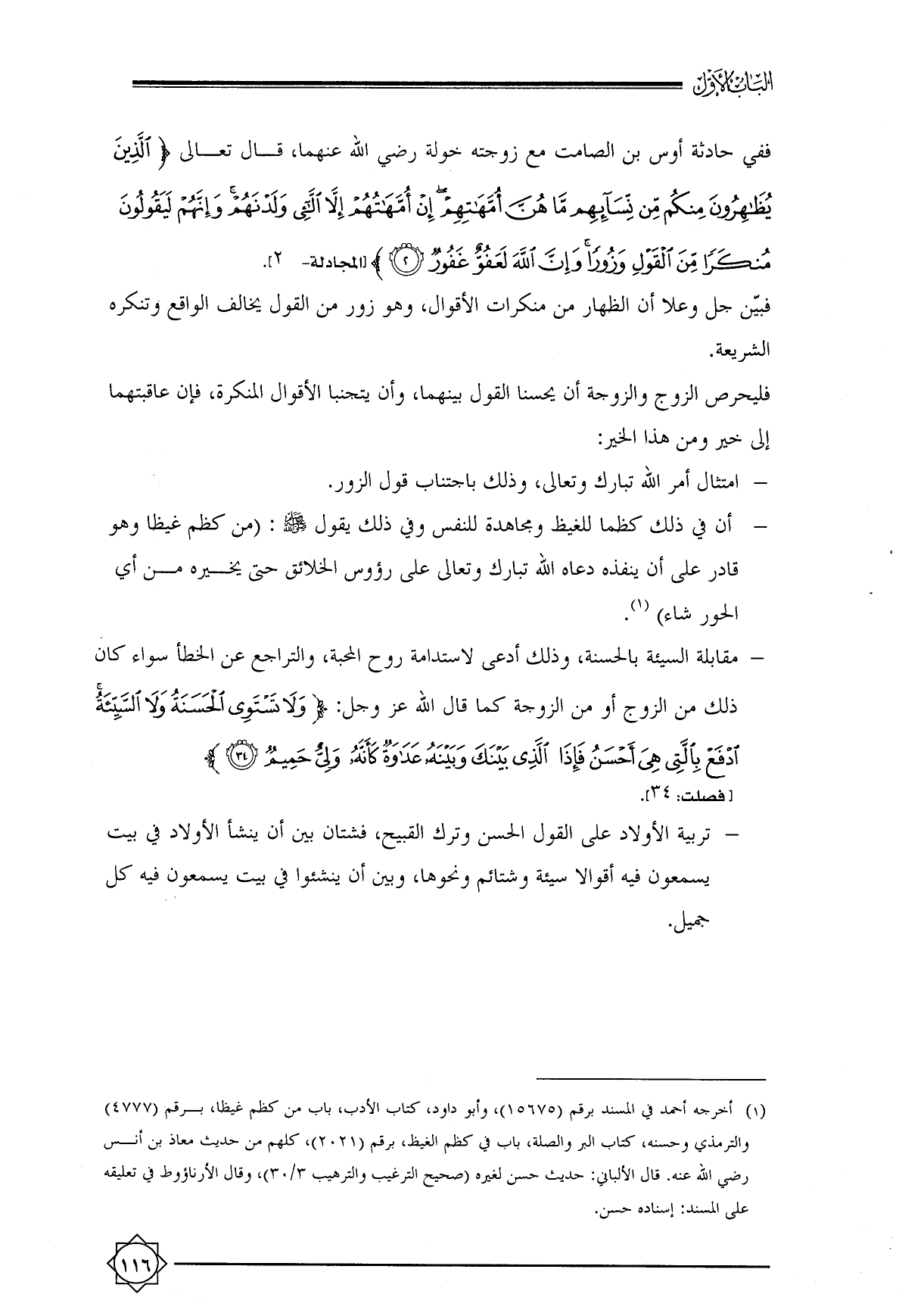 (¬١) {أخرجه أحمد في المسند برقم (١٥٦٧٥) , وأبو داود, كتاب الأدب, باب من كظم غيظا, برقم (٤٧٧٧) والترمذي وحسنه, كتاب البر والصلة, باب في كظم الغيظ, برقم (٢٠٢١) , كلهم من حديث معاذ بن أنس رضي الله عنه. قال الألباني: حديث حسن لغيره (صحيح الترغيب والترهيب ٣/ ٣٠) , وقال الأرناؤوط في تعليقه على المسند: إسناده حسن.