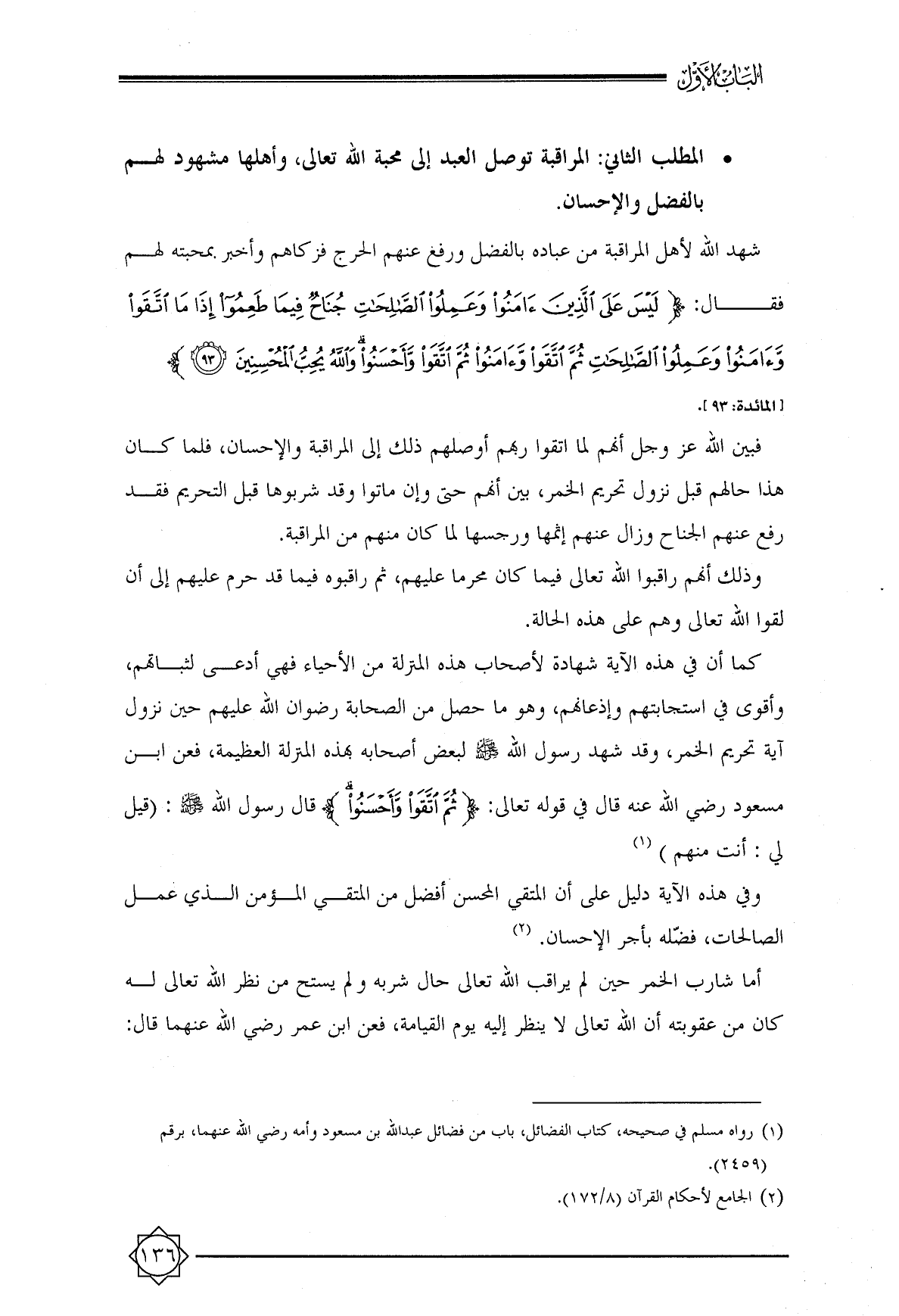 • المطلب الثاني: المراقبة توصل العبد إلى محبة الله تعالى, وأهلها مشهود لهم بالفضل والإحسان.