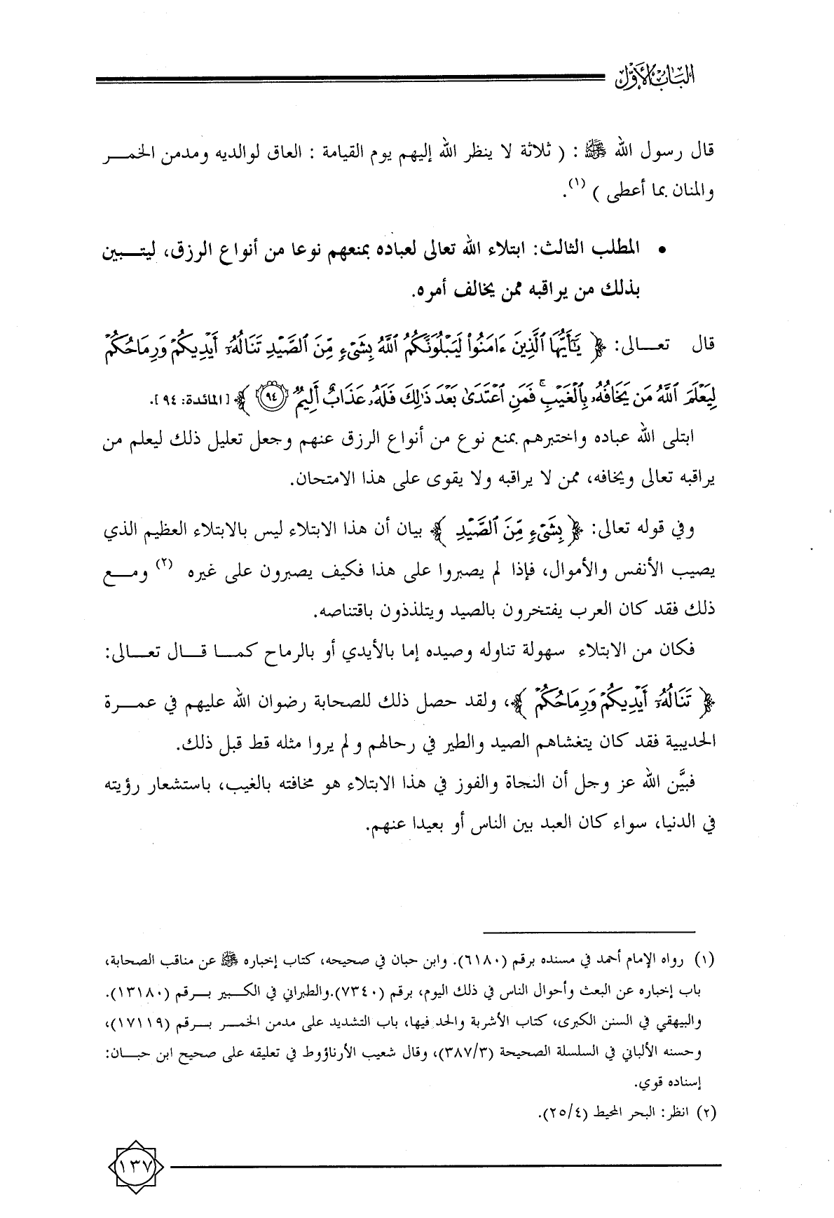 • المطلب الثالث: ابتلاء الله تعالى لعباده بمنعهم نوعا من أنواع الرزق, ليتبين بذلك من يراقبه ممن يخالف أمره.