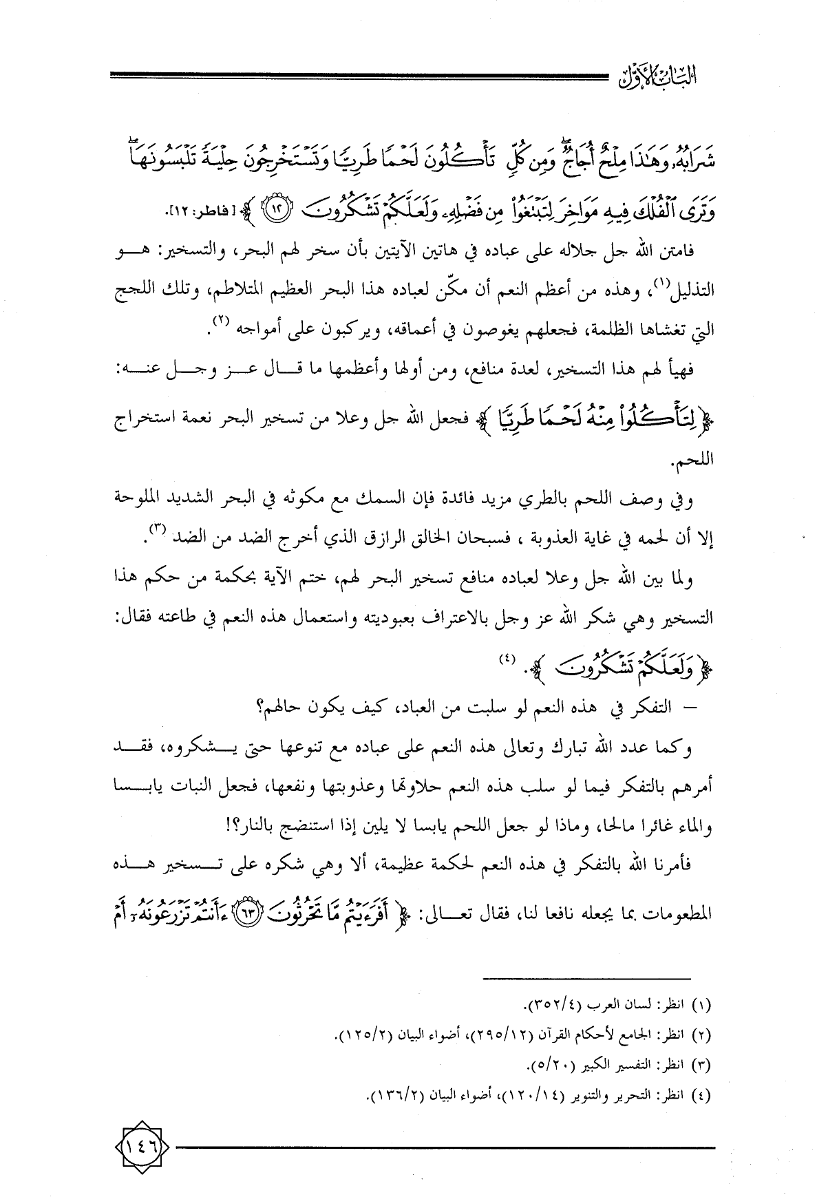 فامتن الله جل جلاله على عباده في هاتين الآيتين بأن سخر لهم البحر, والتسخير: هو التذليل (¬١) , وهذه من أعظم النعم أن مكّن لعباده هذا البحر العظيم المتلاطم, وتلك اللجج التي تغشاها الظلمة, فجعلهم يغوصون في أعماقه, ويركبون على أمواجه (¬٢).