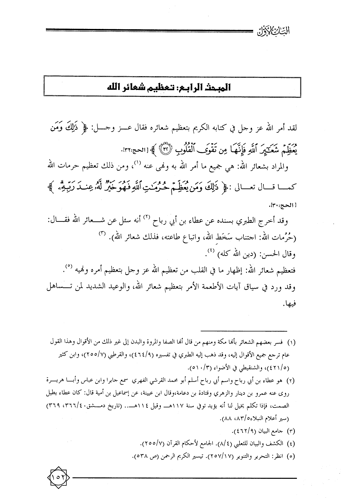 وقد أخرج الطبري بسنده عن عطاء بن أبي رباح (¬٢) أنه سئل عن شعائر الله فقال: (حُرُمات الله: اجتناب سَخَطِ الله، واتباع طاعته، فذلك شعائر الله). (¬٣)