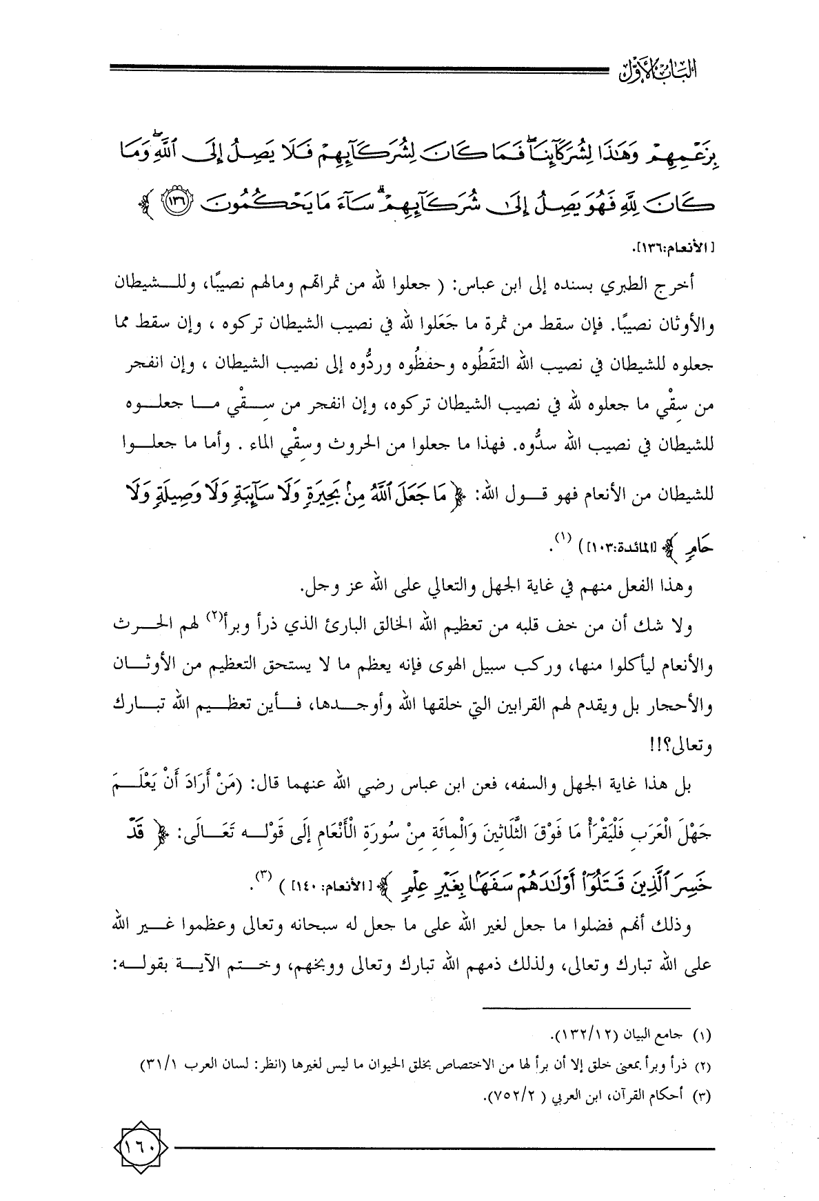 أخرج الطبري بسنده إلى ابن عباس: (جعلوا لله من ثمراتهم وما لهم نصيبًا، وللشيطان والأوثان نصيبًا. فإن سقط من ثمرة ما جَعَلوا لله في نصيب الشيطان تركوه، وإن سقط مما جعلوه للشيطان في نصيب الله التقَطُوه وحفظُوه وردُّوه إلى نصيب الشيطان، وإن انفجر من سِقْي ما جعلوه لله في نصيب الشيطان تركوه، وإن انفجر من سِقْي ما جعلوه للشيطان في نصيب الله سدُّوه. فهذا ما جعلوا من الحروث وسِقْي الماء. وأما ما جعلوا للشيطان من الأنعام فهو قول الله: {مَا جَعَلَ اللَّهُ مِنْ بَحِيرَةٍ وَلَا سَائِبَةٍ وَلَا وَصِيلَةٍ وَلَا حَامٍ} [المائدة:١٠٣]) (¬١).